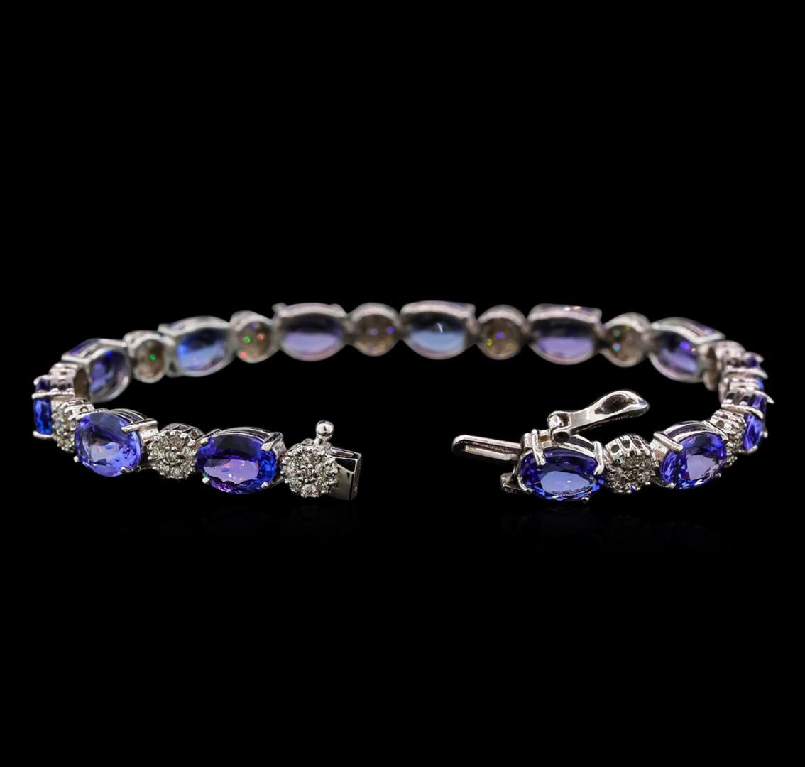 One electronically tested 14KT white gold ladies cast tanzanite and diamond bracelet with a hidden box clasp with safety closer with a bright polish finish. Measurements: 7" in length. Identified with markings of "14K". Condition is new. Containing: Thirteen prong set oval modified brilliant cut natural tanzanites, measuring 8.00. x 6.00. x 3.90mm, approximate total weight of 17.16ct., clarity is eye clean, type I, medium light, very slightly grayish, violet color, (GIA V 4/3), cut is good. One Hundred Four prong set round brilliant cut diamonds, measuring 1.30 - 1.30 x 0.78mm (depth est.) approximate total weight of 104 Stones = 0.83ct. Clarity: SI-2 to I-1. Color: I - J, Cut is Good. Colored gemstones are presumed to have been subjected to commonly used enhancement processes. All diamonds and colored gemstones are graded in the mounting, unless otherwise stated. Total Weight of Colored Stones 17.16ct. Total Weight of Diamonds 0.83ct. Total Weight of Bracelet 15.00 grams. GGL Appraised at $7,700.00.