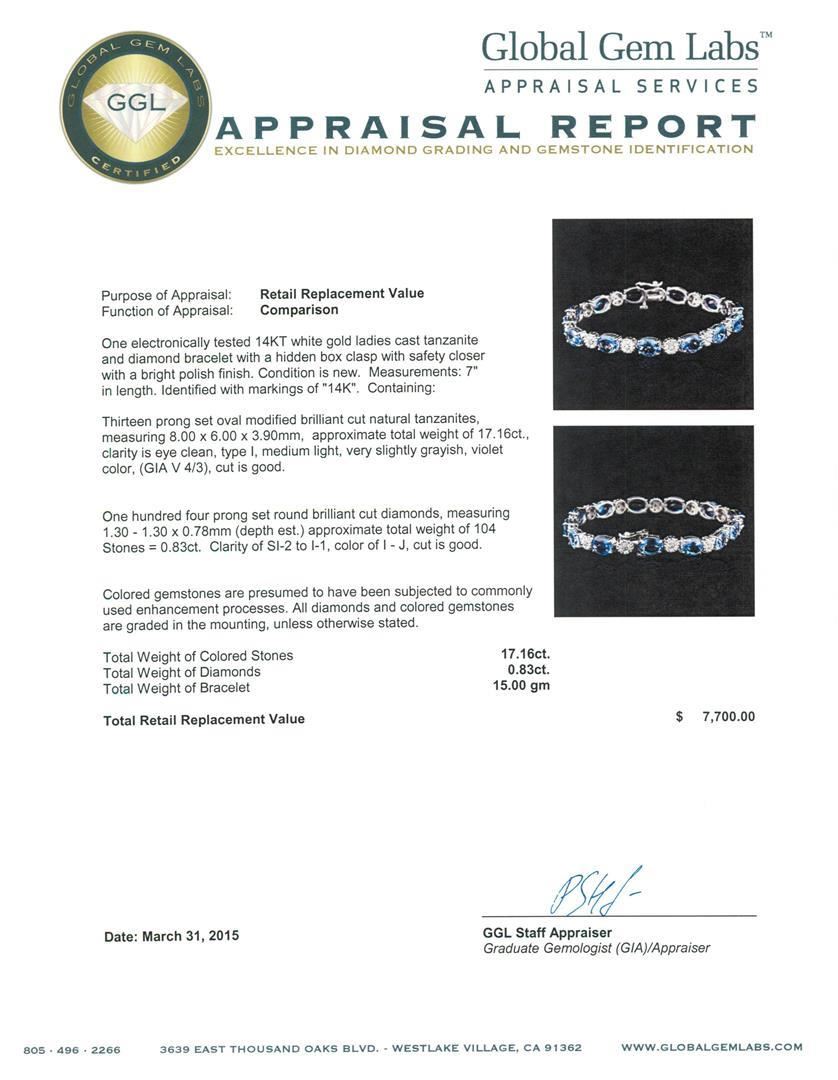 One electronically tested 14KT white gold ladies cast tanzanite and diamond bracelet with a hidden box clasp with safety closer with a bright polish finish. Measurements: 7" in length. Identified with markings of "14K". Condition is new. Containing: Thirteen prong set oval modified brilliant cut natural tanzanites, measuring 8.00. x 6.00. x 3.90mm, approximate total weight of 17.16ct., clarity is eye clean, type I, medium light, very slightly grayish, violet color, (GIA V 4/3), cut is good. One Hundred Four prong set round brilliant cut diamonds, measuring 1.30 - 1.30 x 0.78mm (depth est.) approximate total weight of 104 Stones = 0.83ct. Clarity: SI-2 to I-1. Color: I - J, Cut is Good. Colored gemstones are presumed to have been subjected to commonly used enhancement processes. All diamonds and colored gemstones are graded in the mounting, unless otherwise stated. Total Weight of Colored Stones 17.16ct. Total Weight of Diamonds 0.83ct. Total Weight of Bracelet 15.00 grams. GGL Appraised.