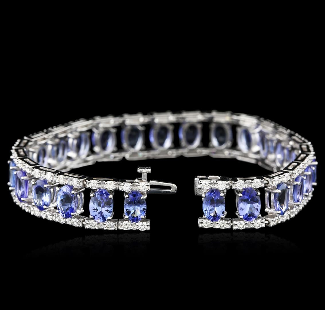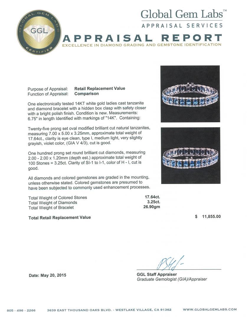 One electronically tested 14KT white gold ladies cast tanzanite and diamond bracelet with a hidden box clasp with safety closer with a bright polish finish. Measurements: 6.75" in length Identified with markings of "14K". Condition is new. Containing: Twenty-five prong set oval modified brilliant cut natural tanzanites, measuring 7.00 x 5.00 x 3.25mm, approximate total weight of 17.64ct., clarity is eye clean, type I, medium light, very slightly grayish, violet color, (GIA V 4/3), cut is good. One Hundred prong set round brilliant cut diamonds, measuring 2.00 - 2.00 x 1.20mm (depth est.) approximate total weight of 100 Stones = 3.25ct. Clarity: SI-1 to I-1. Color: H - I, Cut is Good. All diamonds and colored gemstones are graded in the mounting, unless otherwise stated. Colored gemstones are presumed to have been subjected to commonly used enhancement processes. Total Weight of Colored Stones 17.64ct. Total Weight of Diamonds 3.25ct. Total Weight of Bracelet 26.90 grams. GGL Appraised at $11,855.00.