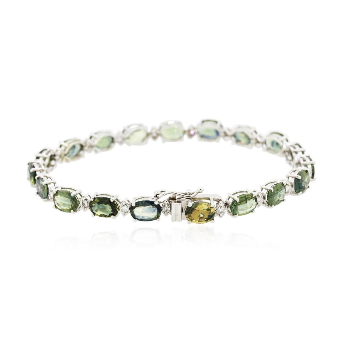 One electronically tested 14KT white gold ladies cast & assembled multi color sapphire and diamond bracelet with a bright polish finish. Seven and one-half inch length bracelet features a flexible multi color sapphire and diamond ribbon, terminating in a concealed clasp with safety. Condition is new, good workmanship. Containing: Nineteen prong set oval mixed cut natural multi color sapphires, measuring 7.00 x 5.15 x 3.00mm, 6% bulge factor, approximate total weight of 17.86ct., clarity is slightly included, cut is good. Transmitting light with a minimum of distortion, transparent. Naturally occurring internal & external characteristics are present. Measurements are an average for the group. The group is composed of a mix of natural blue, very slightly greenish blue, blue green, green and very slightly bluish green color sapphires. Graded in the setting. Nineteen prong set round brilliant cut diamonds, measuring 2.00 - 1.90 x 1.17mm (depth est.) approximate total weight of 19 Stones = 0.61ct. Graded in the setting. Clarity: SI-2 to I-1. Color: G - I. Total Weight of Colored Stones 17.86ct. Total Weight of Diamonds 0.61ct. Total Weight of Bracelet 12.37 grams. AIG Appraised at $14,580.00.