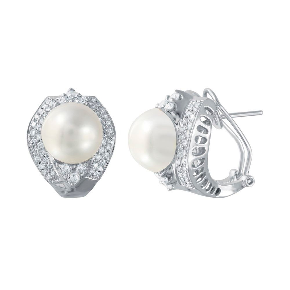 One 14KT White Gold 17.96ctw Pearl and Diamond Earrings. (2) Pearls with a total weight of 17.96cts. (104) Diamonds with a total weight of 1.38cts. Total weight of these earrings are 10.68 grams.
