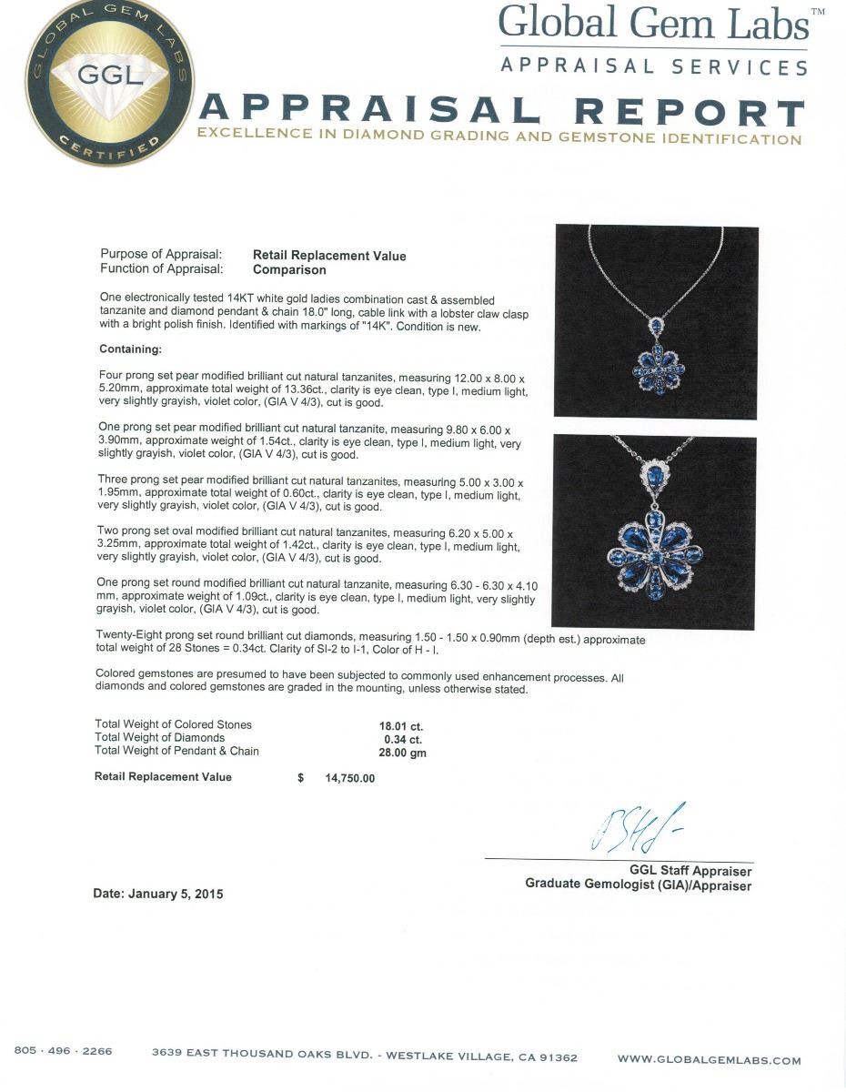 One electronically tested 14KT white gold ladies combination cast & assembled tanzanite and diamond pendant & chain 18.0" long, cable link with a lobster claw clasp with a bright polish finish. Identified with markings of "14K". Condition is new. Containing: Four prong set pear modified brilliant cut natural tanzanites, measuring 12.00 x 8.00 x 5.20mm, approximate total weight of 13.36ct., clarity is eye clean, type I, medium light, very slightly grayish, violet color, (GIA V 4/3), cut is good. One prong set pear modified brilliant cut natural tanzanite, measuring 9.80 x 6.00 x 3.90mm, approximate weight of 1.54ct., clarity is eye clean, type I, medium light, very slightly grayish, violet color, (GIA V 4/3), cut is good. Three prong set pear modified brilliant cut natural tanzanites, measuring 5.00 x 3.00 x 1.95mm, approximate total weight of 0.60ct., clarity is eye clean, type I, medium light, very slightly grayish, violet color, (GIA V 4/3), cut is good. Two prong set oval modified brilliant cut natural tanzanites, measuring 6.20 x 5.00 x 3.25mm, approximate total weight of 1.42ct., clarity is eye clean, type I, medium light, very slightly grayish, violet color, (GIA V 4/3), cut is good. One prong set round modified brilliant cut natural tanzanite, measuring 6.30 - 6.30 x 4.10 mm, approximate weight of 1.09ct., clarity is eye clean, type I, medium light, very slightly grayish, violet color, (GIA V 4/3), cut is good. Twenty-Eight prong set round brilliant cut diamonds, measuring 1.50 - 1.50 x 0.90mm (depth est.) approximate total weight of 28 Stones = 0.34ct. Clarity: SI-2 to I-1. Color: H - I. Colored gemstones are presumed to have been subjected to commonly used enhancement processes. All diamonds and colored gemstones are graded in the mounting, unless otherwise stated. Total Weight of Colored Stones 18.01ct. Total Weight of Diamonds 0.34ct. Total Weight of Pendant & Chain 28.00 grams. GGL Appraised at $14,750.00.