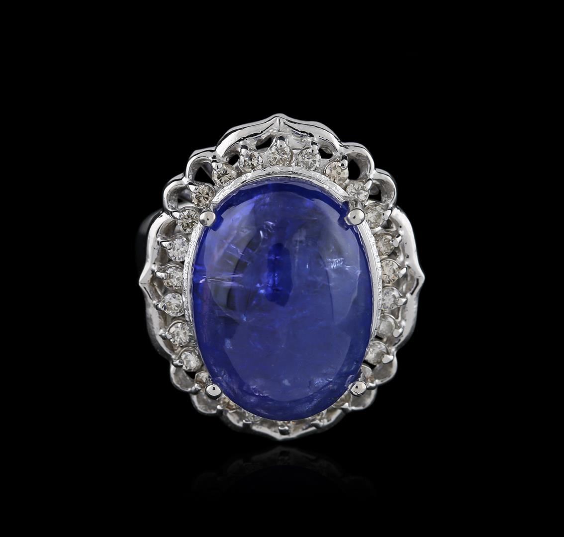 One electronically tested 14KT white gold ladies cast tanzanite and diamond ring with a half round shank with a bright polish finish. Identified with markings of "K14". Condition is new. Containing: One prong set oval cabochon cut natural tanzanite, measuring 16.86 x 12.59 x 8.18mm, approximate weight of 18.03ct., clarity is heavily included, type I, medium, moderately strong, violet color, (GIA V 5/4), cut is good. Twenty-Six prong set round brilliant cut diamonds, measuring 1.20 - 1.20 x 0.72mm (depth est.) approximate total weight of 26 Stones = 0.16ct. Clarity: SI-2 to I-1. Color: I - J, Cut is Good. All diamonds and colored gemstones are graded in the mounting, unless otherwise stated. Colored gemstones are presumed to have been subjected to commonly used enhancement processes.. Total Weight of Colored Stones 18.03ct. Total Weight of Diamonds 0.16ct. Total Weight of Ring 10.80 grams. GGL Appraised at $8,170.00.