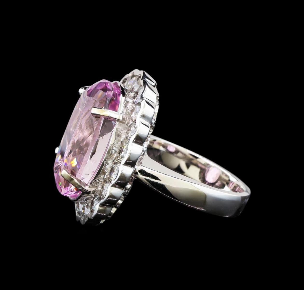 One electronically tested 14KT white gold ladies cast kunzite and diamond ring with a bright polish finish. Identified with markings of "14K". Condition is new. Containing: One prong set oval modified brilliant cut natural kunzite, measuring 18.85 x 13.53 x 10.60mm, approximate weight of 18.05ct., clarity is eye clean, type I, medium light, moderately strong, reddish purple color, (GIA rP 4/4), cut is good. Eighteen prong set round brilliant cut diamonds, measuring 3.20 - 3.20 x 1.92mm (depth est.) approximate total weight of 18 Stones = 2.16ct. Clarity: I-2 to I-3. Color: I - J, Cut is Good. Colored gemstones are presumed to have been subjected to commonly used enhancement processes. All diamonds and colored gemstones are graded in the mounting, unless otherwise stated. Total Weight of Colored Stones 18.05ct. Total Weight of Diamonds 2.16ct. Total Weight of Ring 15.60 grams. GGL Appraised.