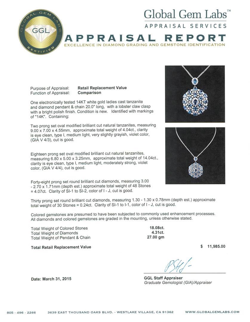 One electronically tested 14KT white gold ladies cast tanzanite and diamond pendant & chain 20.0" long, with a lobster claw clasp with a bright polish finish. Identified with markings of "14K". Condition is new. Containing: Two prong set oval modified brilliant cut natural tanzanites, measuring 9.00. x 7.00. x 4.55mm, approximate total weight of 4.04ct., clarity is eye clean, type I, medium light, very slightly grayish, violet color, (GIA V 4/3), cut is good. Eighteen prong set oval modified brilliant cut natural tanzanites, measuring 6.80 x 5.00. x 3.25mm, approximate total weight of 14.04ct., clarity is eye clean, type I, medium light, moderately strong, violet color, (GIA V 4/4), cut is good. Forty-Eight prong set round brilliant cut diamonds, measuring 3.00. - 2.70 x 1.71mm (depth est.) approximate total weight of 48 Stones = 4.07ct. Clarity: SI-1 to SI-2. Color: I - J, Cut is Good. Thirty prong set round brilliant cut diamonds, measuring 1.30 - 1.30 x 0.78mm (depth est.) approximate total weight of 30 Stones = 0.24ct. Clarity: SI-1 to I-1. Color: I - J, Cut is Good. Colored gemstones are presumed to have been subjected to commonly used enhancement processes. All diamonds and colored gemstones are graded in the mounting, unless otherwise stated. Total Weight of Colored Stones 18.08ct. Total Weight of Diamonds 4.31ct. Total Weight of Pendant & Chain 27.00 grams. GGL Appraised at $11,985.00.