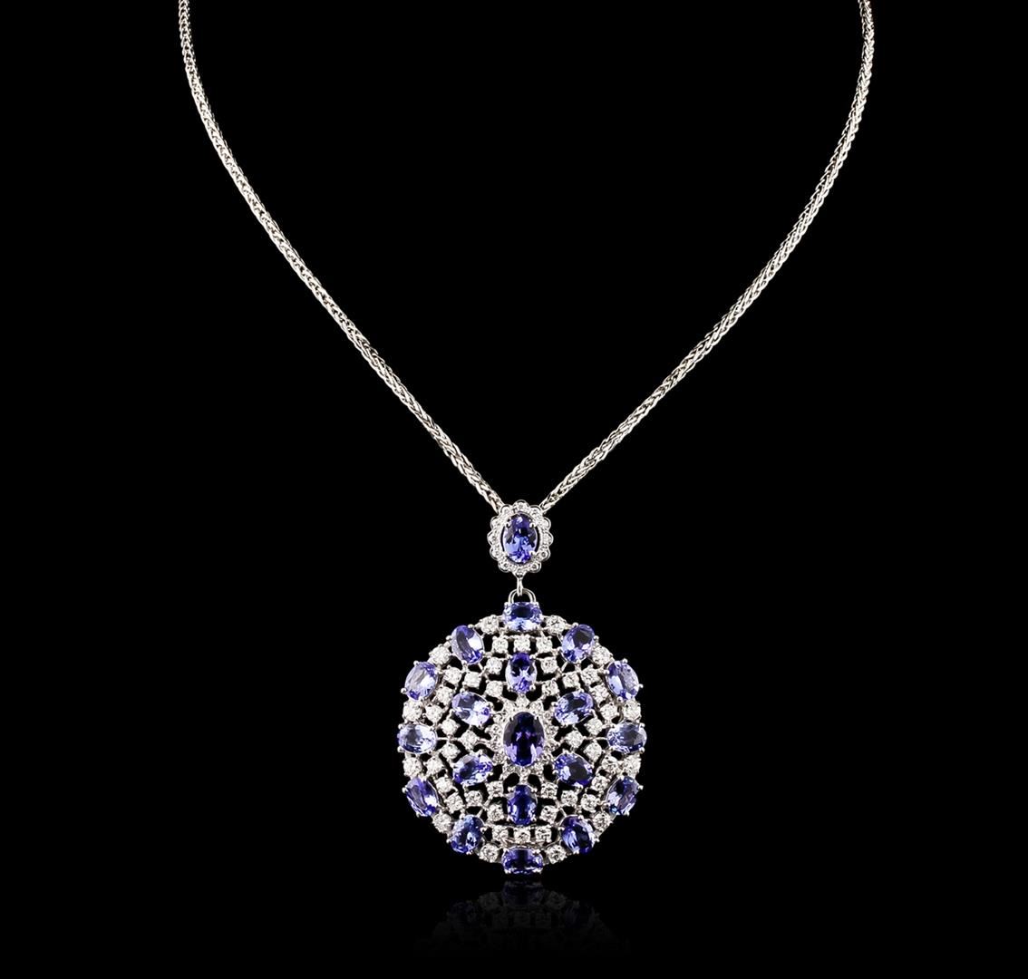 One electronically tested 14KT white gold ladies cast tanzanite and diamond pendant & chain 20.0" long, with a lobster claw clasp with a bright polish finish. Identified with markings of "14K". Condition is new. Containing: Two prong set oval modified brilliant cut natural tanzanites, measuring 9.00. x 7.00. x 4.55mm, approximate total weight of 4.04ct., clarity is eye clean, type I, medium light, very slightly grayish, violet color, (GIA V 4/3), cut is good. Eighteen prong set oval modified brilliant cut natural tanzanites, measuring 6.80 x 5.00. x 3.25mm, approximate total weight of 14.04ct., clarity is eye clean, type I, medium light, moderately strong, violet color, (GIA V 4/4), cut is good. Forty-Eight prong set round brilliant cut diamonds, measuring 3.00. - 2.70 x 1.71mm (depth est.) approximate total weight of 48 Stones = 4.07ct. Clarity: SI-1 to SI-2. Color: I - J, Cut is Good. Thirty prong set round brilliant cut diamonds, measuring 1.30 - 1.30 x 0.78mm (depth est.) approximate total weight of 30 Stones = 0.24ct. Clarity: SI-1 to I-1. Color: I - J, Cut is Good. Colored gemstones are presumed to have been subjected to commonly used enhancement processes. All diamonds and colored gemstones are graded in the mounting, unless otherwise stated. Total Weight of Colored Stones 18.08ct. Total Weight of Diamonds 4.31ct. Total Weight of Pendant & Chain 27.00 grams. GGL Appraised at $11,985.00.