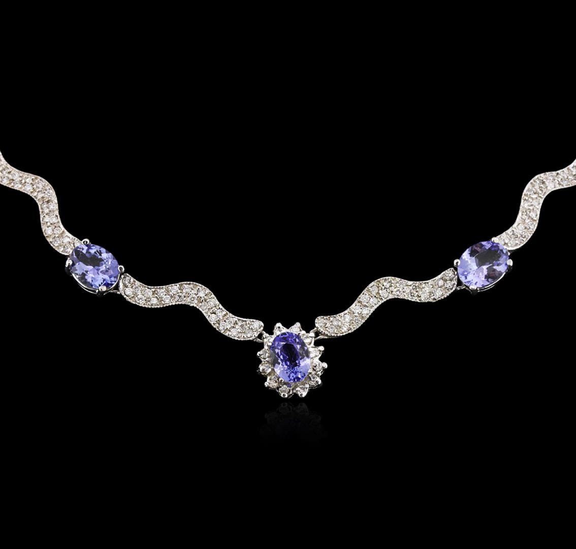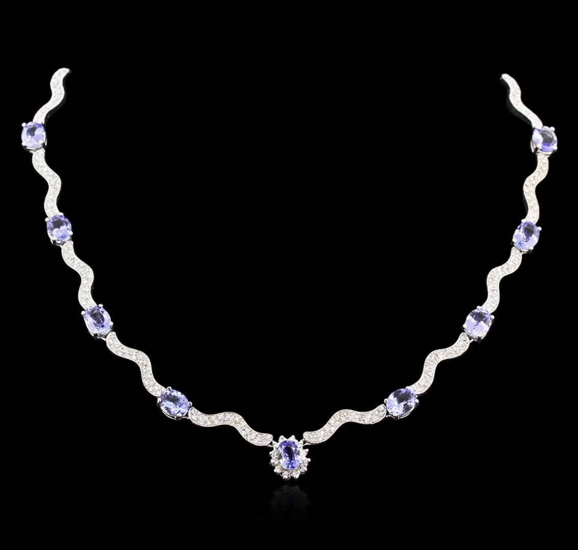 One electronically tested 14KT white gold ladies cast tanzanite and diamond necklace with a bright polish finish. Measurements: 18" in length Identified with markings of "14K". Condition is new. Containing: Thirteen prong set oval modified brilliant cut natural tanzanites, measuring 8.00 x 6.20 x 4.03mm, approximate total weight of 18.33ct., clarity is eye clean, type I, medium light, very slightly grayish, violet color, (GIA V 4/3), cut is good. Three Hundred Thirty-Four prong set round brilliant cut diamonds, measuring 1.50 - 1.50 x 0.90mm (depth est.) approximate total weight of 334 Stones = 4.11ct. Clarity: SI-1 to SI-2. Color: I - J, Cut is Good. Colored gemstones are presumed to have been subjected to commonly used enhancement processes. All diamonds and colored gemstones are graded in the mounting, unless otherwise stated. Total Weight of Colored Stones 18.33ct. Total Weight of Diamonds 4.11ct. Total Weight of Necklace 34.10 grams. GGL Appraised at $15,325.00.