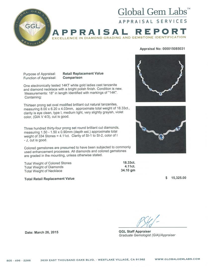 One electronically tested 14KT white gold ladies cast tanzanite and diamond necklace with a bright polish finish. Measurements: 18" in length Identified with markings of "14K". Condition is new. Containing: Thirteen prong set oval modified brilliant cut natural tanzanites, measuring 8.00 x 6.20 x 4.03mm, approximate total weight of 18.33ct., clarity is eye clean, type I, medium light, very slightly grayish, violet color, (GIA V 4/3), cut is good. Three Hundred Thirty-Four prong set round brilliant cut diamonds, measuring 1.50 - 1.50 x 0.90mm (depth est.) approximate total weight of 334 Stones = 4.11ct. Clarity: SI-1 to SI-2. Color: I - J, Cut is Good. Colored gemstones are presumed to have been subjected to commonly used enhancement processes. All diamonds and colored gemstones are graded in the mounting, unless otherwise stated. Total Weight of Colored Stones 18.33ct. Total Weight of Diamonds 4.11ct. Total Weight of Necklace 34.10 grams. GGL Appraised at $15,325.00.