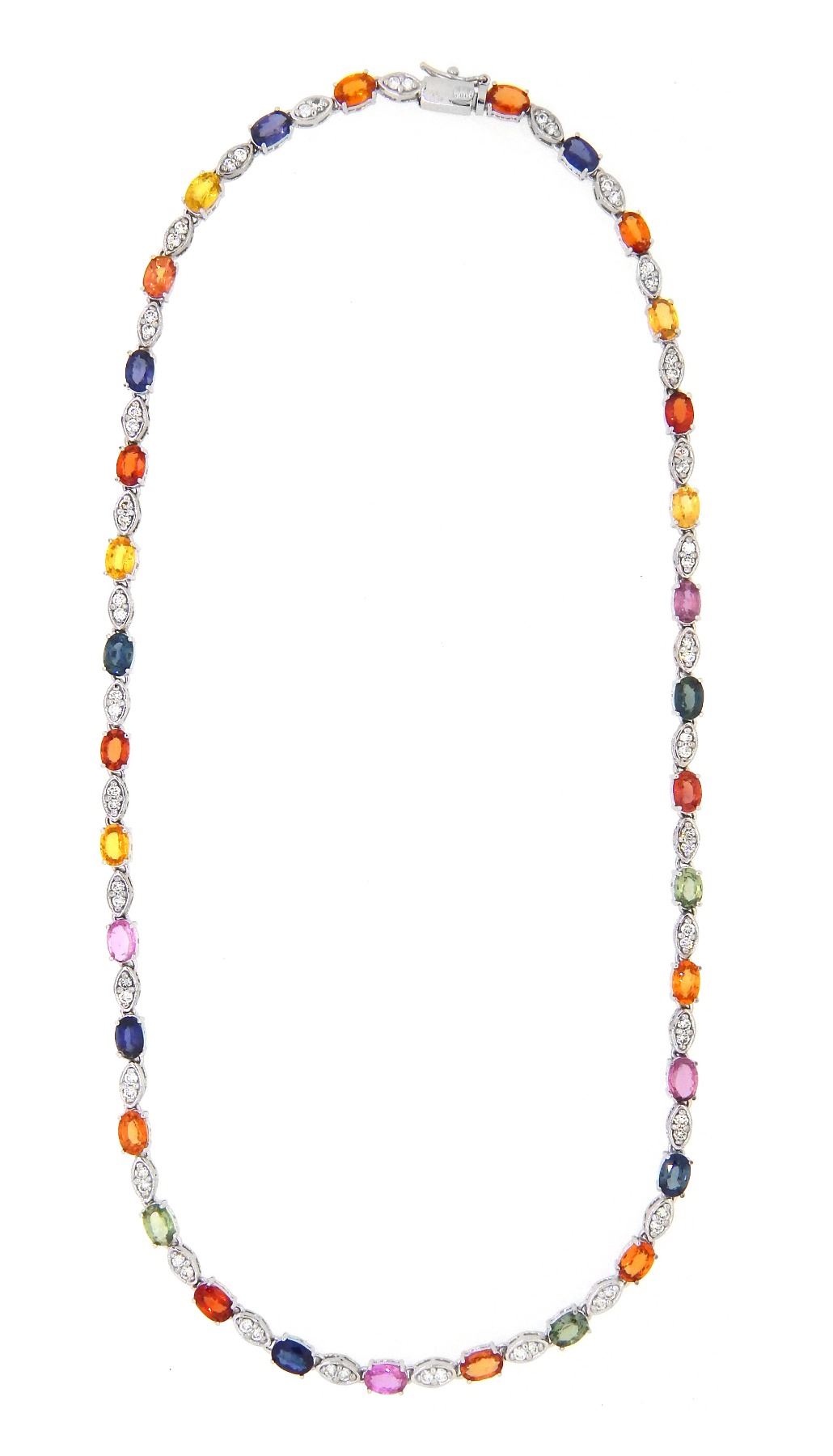 One 14KT White Gold 18.50ctw Multi Color Sapphire and Diamond Necklace. (33) Multi color Sapphires with a total weight of 18.50cts. (66) Diamonds with a total weight of 1.94cts with a color of H-I and clarity of VS-2 to SI-1. Total weight of this pendant is 25.3 grams.