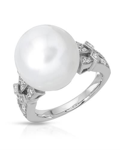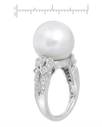 One 14KT White Gold 19.09ct Pearl and Diamond Ring. (1) Pearl with a total weight of 19.09cts. (28) Round Diamonds with a total weight of 0.28cts with a color of I and clarity of I-1. (4) Princess cut Diamonds with a total weight of 0.10cts with a color of G-H and clarity of SI-2. Total weight of this ring is 5.97 grams.