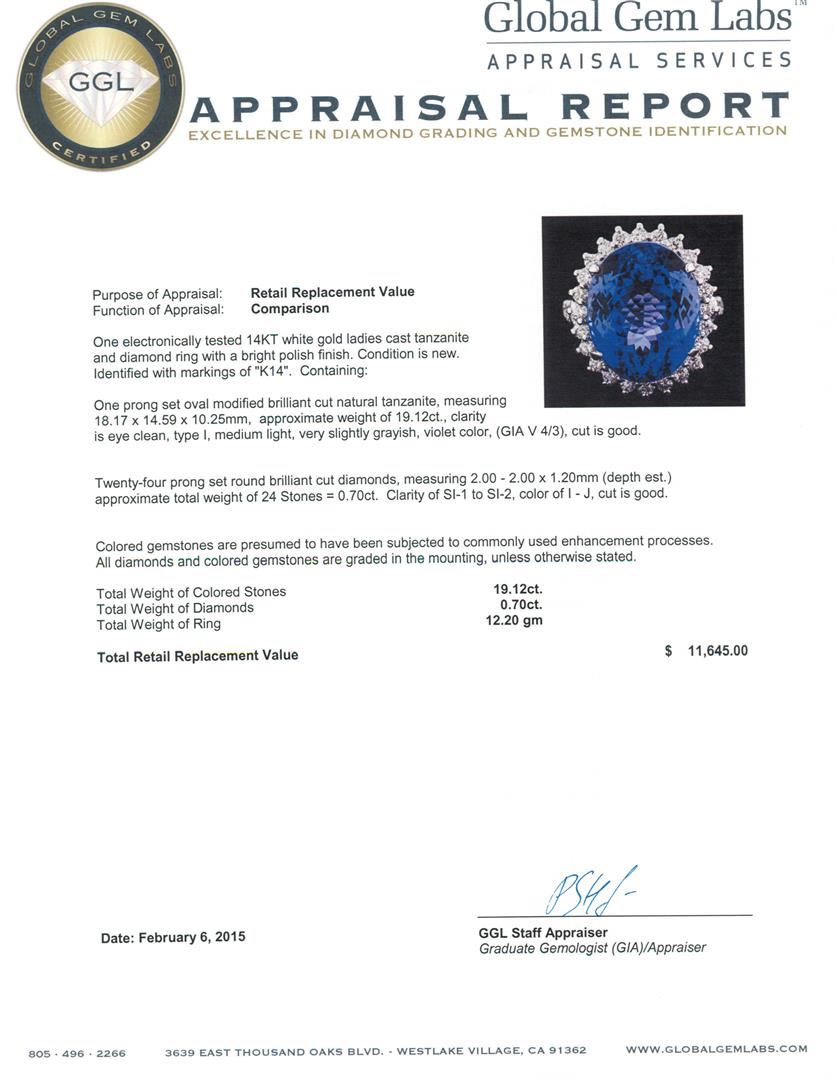 One electronically tested 14KT white gold ladies cast tanzanite and diamond ring with a bright polish finish. Identified with markings of "K14". Condition is new. Containing: One prong set oval modified brilliant cut natural tanzanite, measuring 18.17 x 14.59 x 10.25mm, approximate weight of 19.12ct., clarity is eye clean, type I, medium light, very slightly grayish, violet color, (GIA V 4/3), cut is good. Twenty-Four prong set round brilliant cut diamonds, measuring 2.00 - 2.00 x 1.20mm (depth est.) approximate. total weight of 24 Stones = 0.70ct. Clarity: SI-1 to SI-2. Color: I - J, Cut is Good. Colored gemstones are presumed to have been subjected to commonly used enhancement processes. All diamonds and colored gemstones are graded in the mounting, unless otherwise stated. Total Weight of Colored Stones 19.12ct. Total Weight of Diamonds 0.70ct. Total Weight of Ring 12.20 grams. GGL Appraised at $11,645.00.