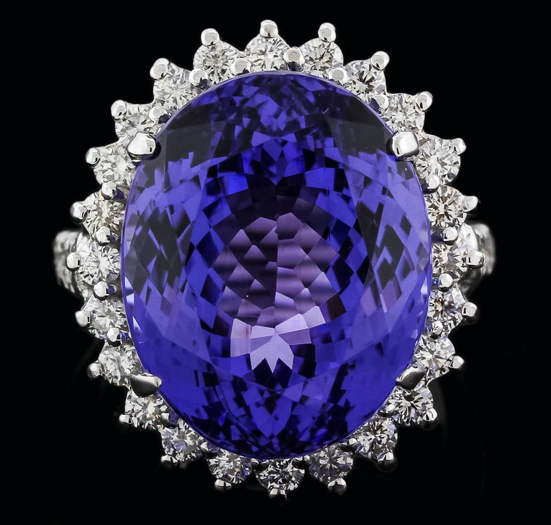 One electronically tested 14KT white gold ladies cast tanzanite and diamond ring with a bright polish finish. Identified with markings of "K14". Condition is new. Containing: One prong set oval modified brilliant cut natural tanzanite, measuring 18.17 x 14.59 x 10.25mm, approximate weight of 19.12ct., clarity is eye clean, type I, medium light, very slightly grayish, violet color, (GIA V 4/3), cut is good. Twenty-Four prong set round brilliant cut diamonds, measuring 2.00 - 2.00 x 1.20mm (depth est.) approximate. total weight of 24 Stones = 0.70ct. Clarity: SI-1 to SI-2. Color: I - J, Cut is Good. Colored gemstones are presumed to have been subjected to commonly used enhancement processes. All diamonds and colored gemstones are graded in the mounting, unless otherwise stated. Total Weight of Colored Stones 19.12ct. Total Weight of Diamonds 0.70ct. Total Weight of Ring 12.20 grams. GGL Appraised at $11,645.00.