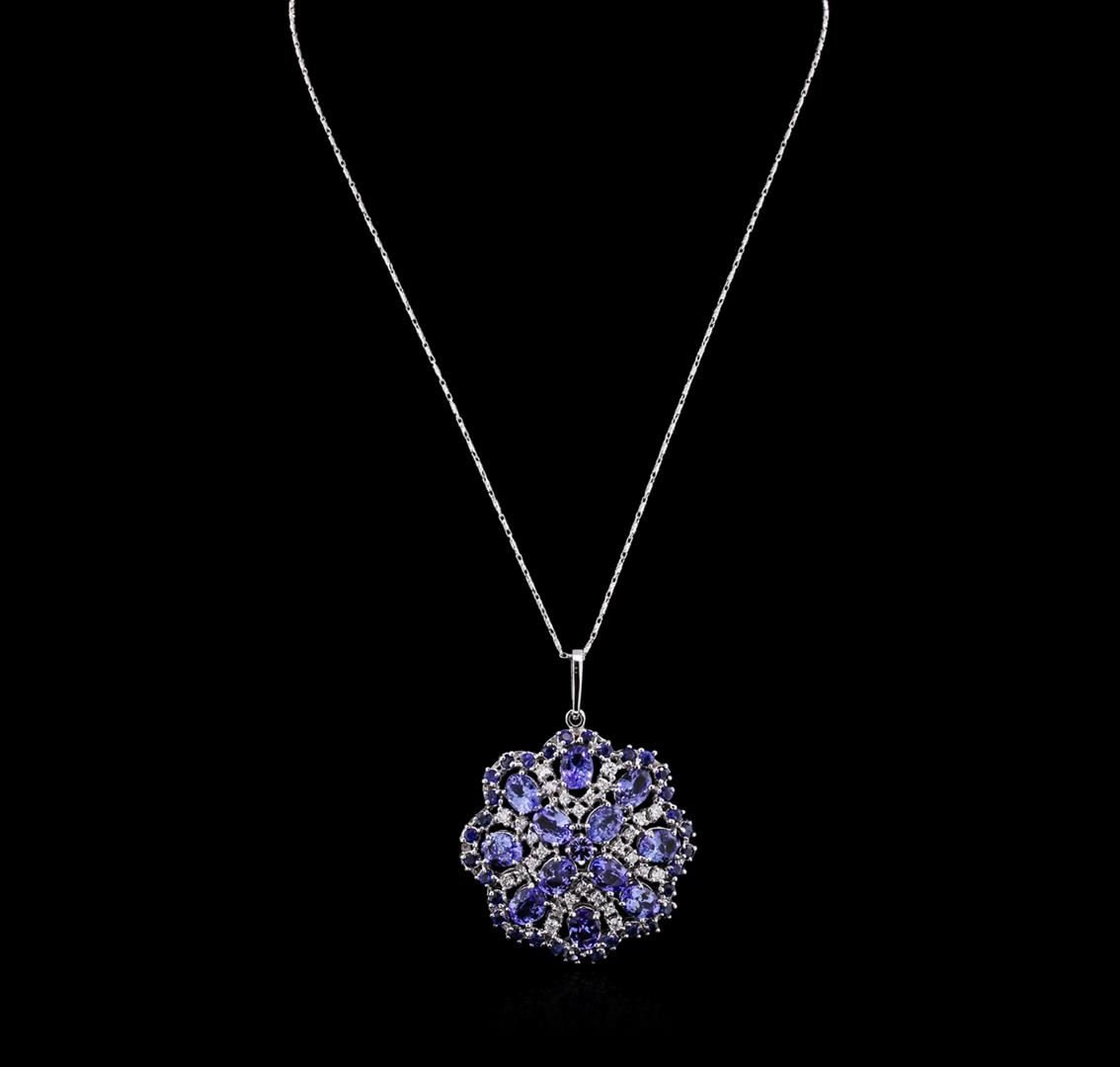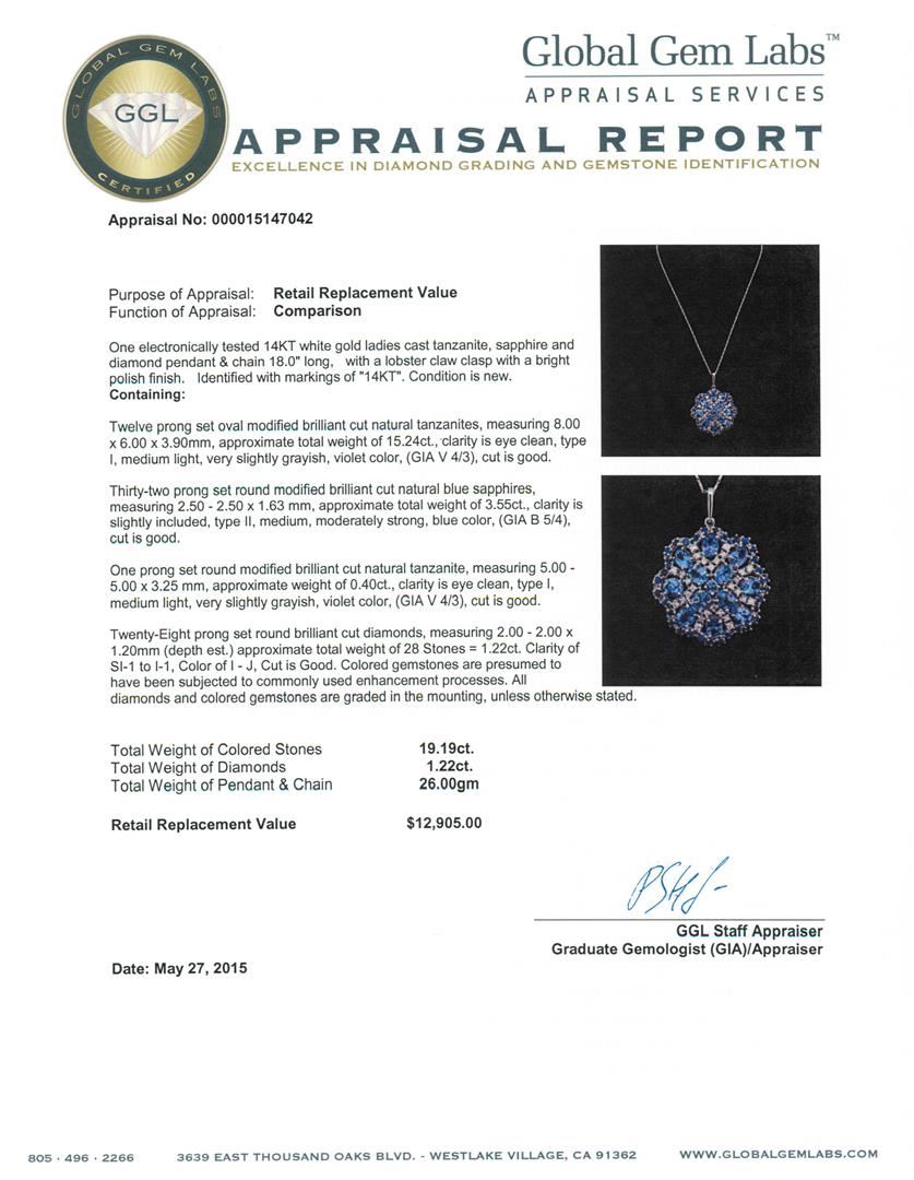One electronically tested 14KT white gold ladies cast tanzanite, sapphire and diamond pendant & chain 18.0" long, with a lobster claw clasp with a bright polish finish. Identified with markings of "14KT". Condition is new. Containing: Twelve prong set oval modified brilliant cut natural tanzanites, measuring 8.00 x 6.00 x 3.90mm, approximate total weight of 15.24ct., clarity is eye clean, type I, medium light, very slightly grayish, violet color, (GIA V 4/3), cut is good. Thirty-two prong set round modified brilliant cut natural blue sapphires, measuring 2.50 - 2.50 x 1.63 mm, approximate total weight of 3.55ct., clarity is slightly included, type II, medium, moderately strong, blue color, (GIA B 5/4), cut is good. One prong set round modified brilliant cut natural tanzanite, measuring 5.00 - 5.00 x 3.25 mm, approximate weight of 0.40ct., clarity is eye clean, type I, medium light, very slightly grayish, violet color, (GIA V 4/3), cut is good. Twenty-Eight prong set round brilliant cut diamonds, measuring 2.00 - 2.00 x 1.20mm (depth est.) approximate total weight of 28 Stones = 1.22ct. Clarity: SI-1 to I-1. Color: I - J, Cut is Good. Colored gemstones are presumed to have been subjected to commonly used enhancement processes. All diamonds and colored gemstones are graded in the mounting, unless otherwise stated. Total Weight of Colored Stones 19.19ct. Total Weight of Diamonds 1.22ct. Total Weight of Pendant & Chain 26.00 grams. GGL Appraised at $12,905.00.