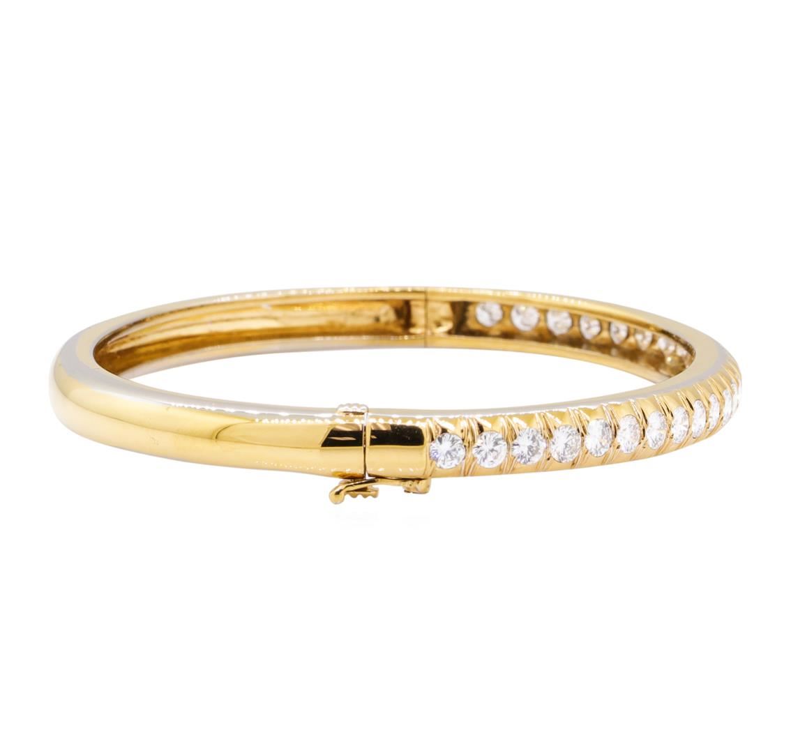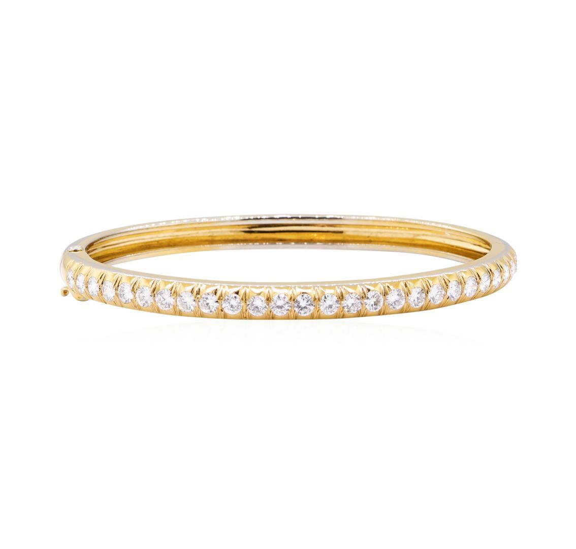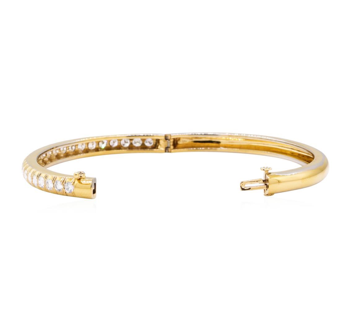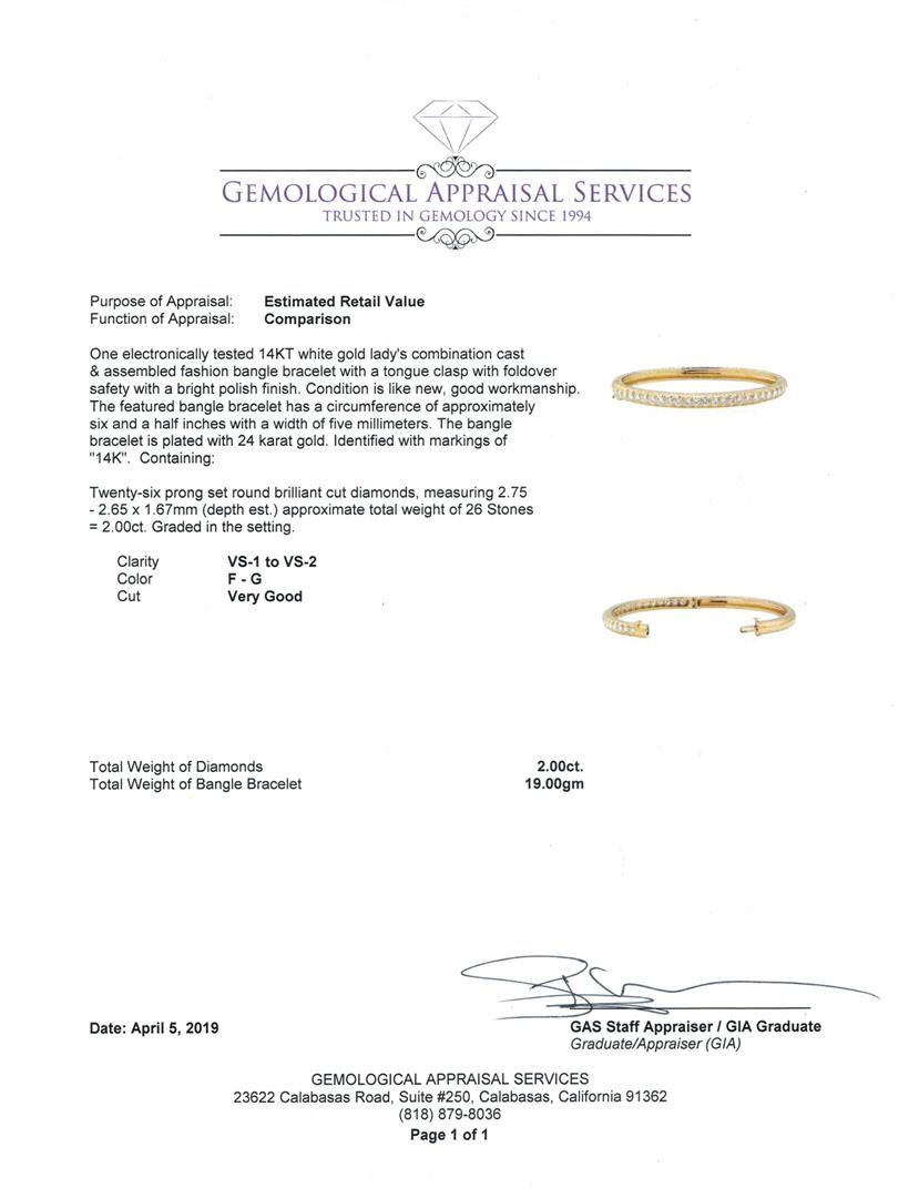 One electronically tested 14KT white gold lady's combination cast & assembled fashion bangle bracelet with a tongue clasp with foldover safety with a bright polish finish. The featured bangle bracelet has a circumference of approximately six and a half inches with a width of five millimeters. The bangle bracelet is plated with 24 karat gold. Identified with markings of '14K'. Condition is like new, good workmanship. Containing: Twenty-Six prong set round brilliant cut diamonds, measuring 2.75 - 2.65 x 1.67mm (depth est.) approximate total weight of 26 Stones = 2.00ct. Graded in the setting. Color F - G Clarity VS-1 to VS-2 Cut Very Good. Total Weight of Diamonds 2.00ct. Total Weight of Bangle Bracelet 19.00gm. GAS Appraised.