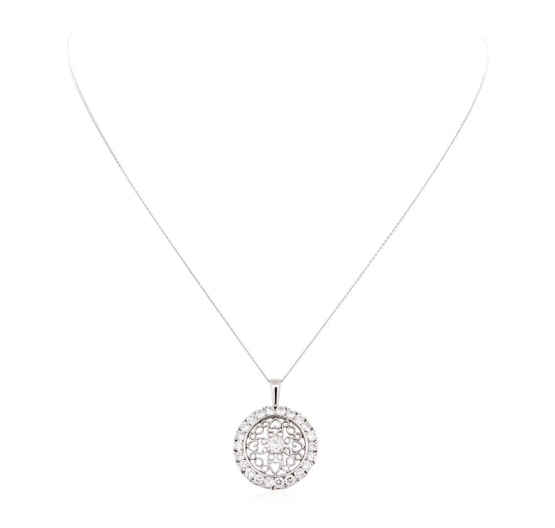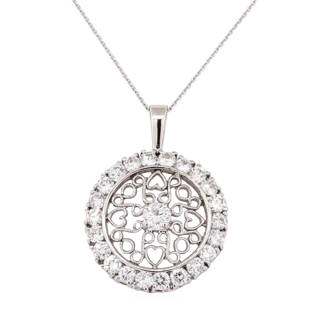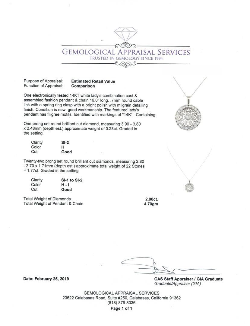 One electronically tested 14KT white gold lady's combination cast & assembled fashion pendant & chain 16.0' long,.7mm round cable link with a spring ring clasp with a bright polish with milgrain detailing finish. The featured lady's pendant has filigree motifs. Identified with markings of '14K'. Condition is new, good workmanship. Containing: One prong set round brilliant cut diamond, measuring 3.90 - 3.80 x 2.48mm (depth est.) approximate weight of 0.23ct. Graded in the setting. Color H, Clarity SI-2, Cut Good Twenty-Two prong set round brilliant cut diamonds, measuring 2.80 - 2.70 x 1.71mm (depth est.) approximate total weight of 22 Stones = 1.77ct. Graded in the setting. Color H - I, Clarity SI-1 to SI-2, Cut Good. Total Weight of Diamonds 2.00ct. Total Weight of Pendant & Chain 4.70gm. GAS Appraised.