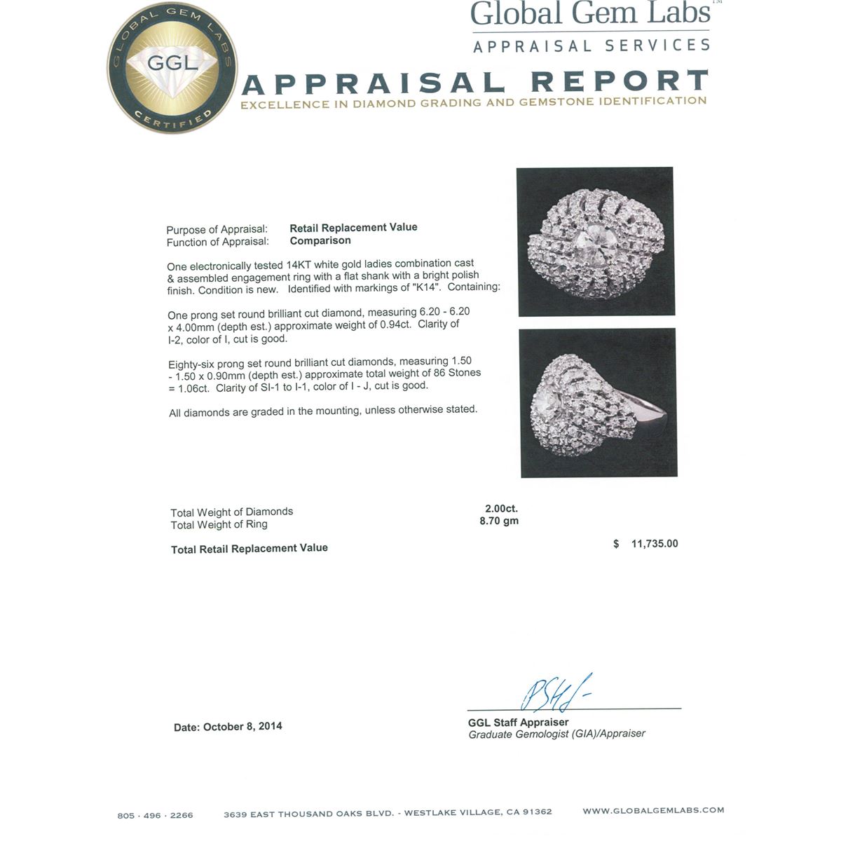 One electronically tested 14KT white gold ladies combination cast & assembled engagement ring with a flat shank with a bright polish finish. Identified with markings of "K14". Condition is new. Containing: One prong set round brilliant cut diamond, measuring 6.20 - 6.20 x 4.00mm (depth est.) approximate weight of 0.94ct. Clarity: I-2. Color: I, Cut is Good. Eighty-Six prong set round brilliant cut diamonds, measuring 1.50 - 1.50 x 0.90mm (depth est.) approximate total weight of 86 Stones = 1.06ct. Clarity: SI-1 to I-1. Color: I - J, Cut is Good. All diamonds are graded in the mounting, unless otherwise stated. Total Weight of Diamonds 2.00ct. Total Weight of Ring 8.70 grams. GGL Appraised at $11,735.00.
