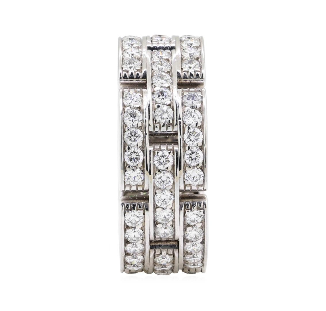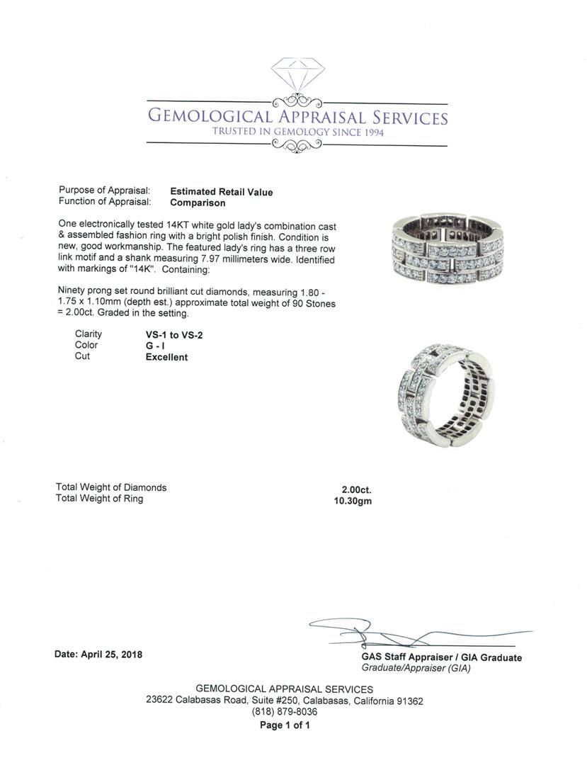 One electronically tested 14KT white gold Ladies combination cast & assembled fashion ring with a bright polish finish. The featured Ladies ring has a three row link motif and a shank measuring 7.97 millimeters wide. Identified with markings of '14K'. Condition is new, good workmanship. Containing: Ninety prong set round brilliant cut diamonds, measuring 1.80 - 1.75 x 1.10mm (depth est.) approximate total weight of 90 Stones = 2.00ct. Graded in the setting. Color G - I Clarity VS-1 to VS-2 Cut Excellent. Total Weight of Diamonds 2.00ct.. Total Weight of Ring 10.30gm. GAS Appraised.
