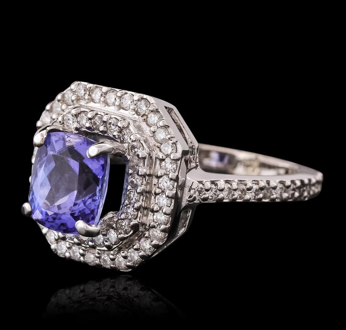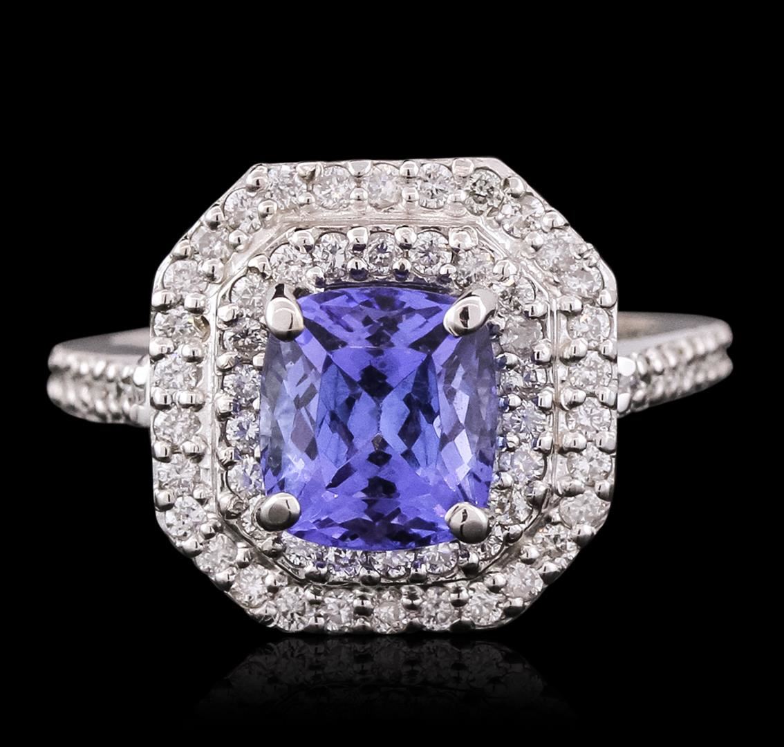 One electronically tested 14KT white gold ladies combination cast & assembled tanzanite and diamond ring with a flat shank with a bright polish finish. Identified with markings of "14K". Condition is new. Containing: One prong set square cushion modified brilliant cut natural tanzanite, measuring 7.72 x 6.90 x 4.75mm, approximate weight of 2.00ct., clarity is eye clean, type I, medium light, very slightly grayish, violet color, (GIA V 4/3), cut is good. Eighty-Five prong set round brilliant cut diamonds, measuring 1.30 - 1.30 x 0.78mm (depth est.) approximate total weight of 85 Stones = 0.68ct. Clarity: I-1 to I-2. Color: I - J, Cut is Good. Colored gemstones are presumed to have been subjected to commonly used enhancement processes. All diamonds and colored gemstones are graded in the mounting, unless otherwise stated. Total Weight of Colored Stones 2.00ct. Total Weight of Diamonds 0.68ct. Total Weight of Ring 5.20 grams. GGL Appraised at $5,690.00.