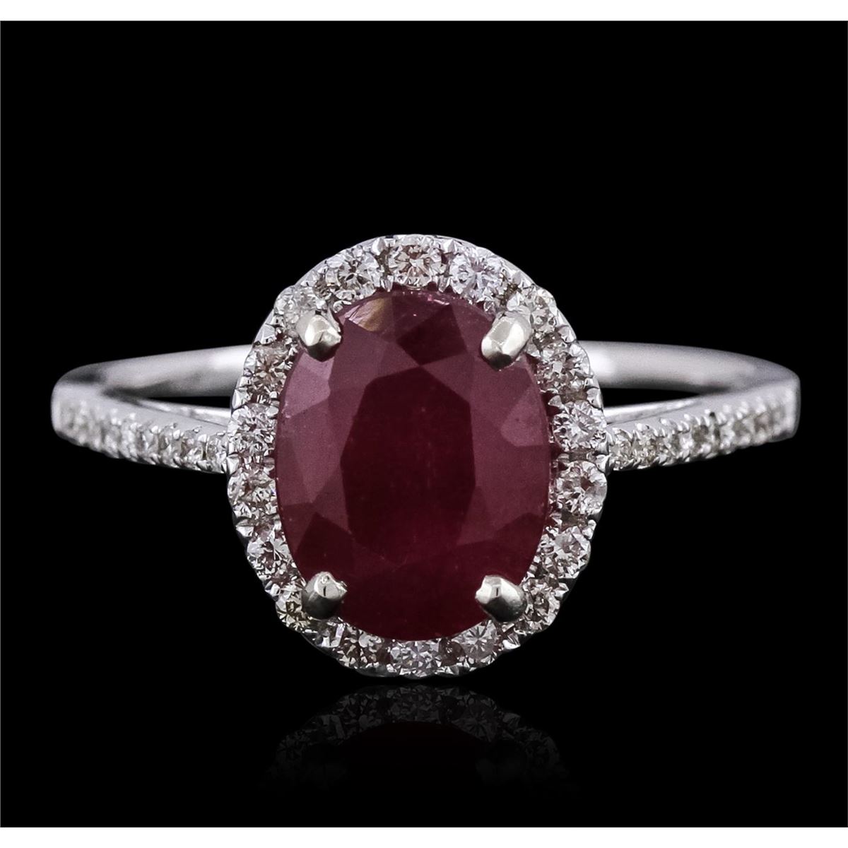 One electronically tested 14KT white gold ladies cast ruby and diamond ring with a bright polish finish. Condition is new, good workmanship. The featured ruby is set within a diamond bezel supported by diamond set shoulders, completed by a one millimeter wide band. Trademark is PMI. Identified with markings of "14K". Containing: One prong set oval mixed cut natural ruby, measuring 9.00 x 7.05 x 3.60mm, 8%. bulge factor, approximate weight of 2.00ct., clarity is heavily included, type II, dark, very slightly brownish, red color, (GIA R 7/3), cut is good. Transmitting light somewhat diffusely, transparent to translucent. Naturally occurring internal & external characteristics are present. Indications of laboratory high temperature heat treatment, with glass & flux additives. Graded in the setting. Ruby has a low tolerance to rhodium plating, repolishing the surface, & ultrasonic cleaning. Thirty-Six prong set round brilliant cut diamonds, measuring 1.30 - 1.00 x 0.69mm (depth est.) approximate. Total Weight of 36 Stones = 0.29ct. Graded in the setting. Clarity: SI-1 to I-1. Color: H - J. Total Weight of Colored Stones 2.00ct. Total Weight of Diamonds 0.29ct. Total Weight of Ring 2.36 grams. AIG Appraised at $1,860.00.