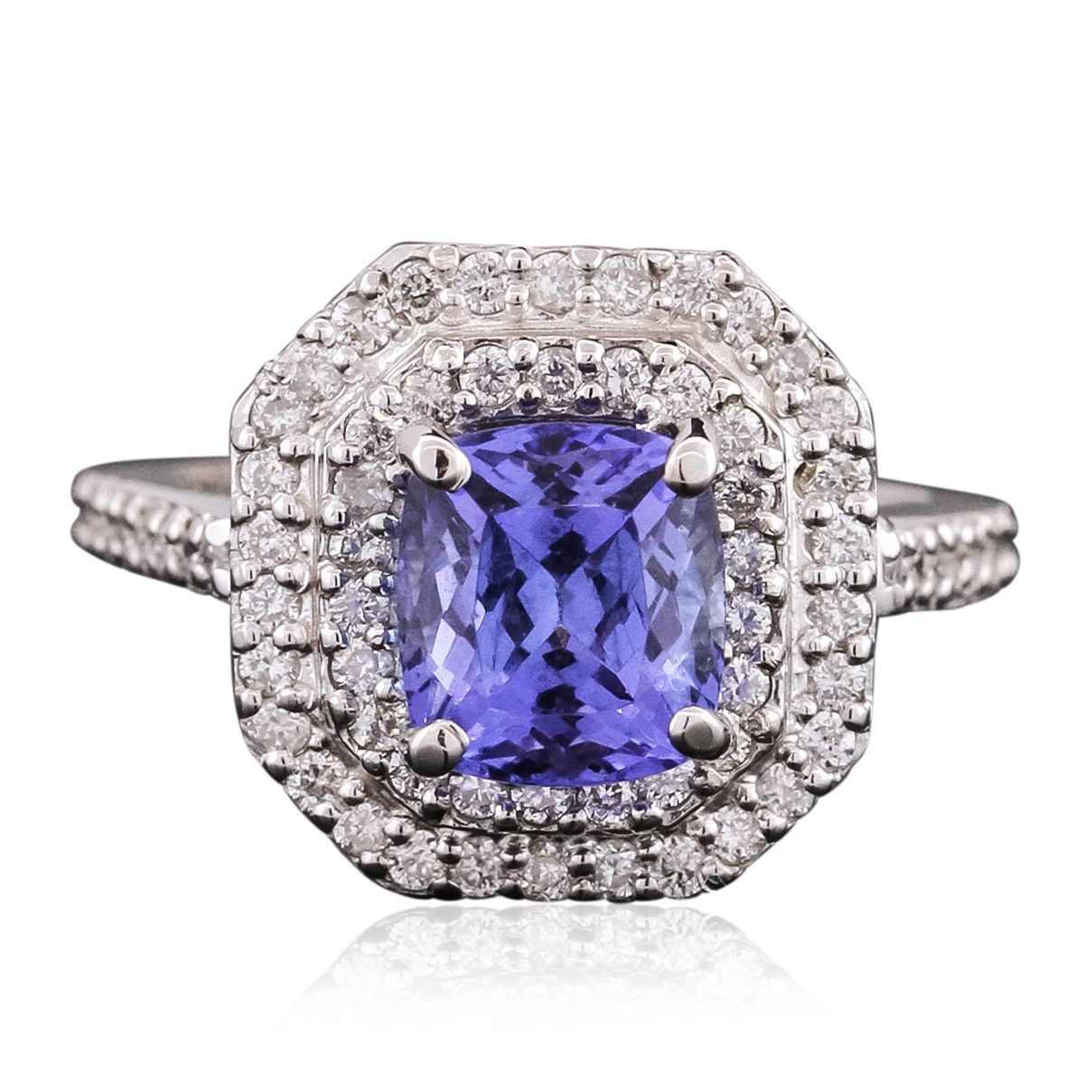 One electronically tested 14KT white gold ladies combination cast & assembled tanzanite and diamond ring with a flat shank with a bright polish finish. Identified with markings of "14K". Condition is new. Containing: One prong set square cushion modified brilliant cut natural tanzanite, measuring 7.72 x 6.90 x 4.75mm, approximate weight of 2.00ct., clarity is eye clean, type I, medium light, very slightly grayish, violet color, (GIA V 4/3), cut is good. Eighty-Five prong set round brilliant cut diamonds, measuring 1.30 - 1.30 x 0.78mm (depth est.) approximate total weight of 85 Stones = 0.68ct. Clarity: I-1 to I-2. Color: I - J, Cut is Good. Colored gemstones are presumed to have been subjected to commonly used enhancement processes. All diamonds and colored gemstones are graded in the mounting, unless otherwise stated. Total Weight of Colored Stones 2.00ct. Total Weight of Diamonds 0.68ct. Total Weight of Ring 5.20 grams. GGL Appraised at $5,690.00.