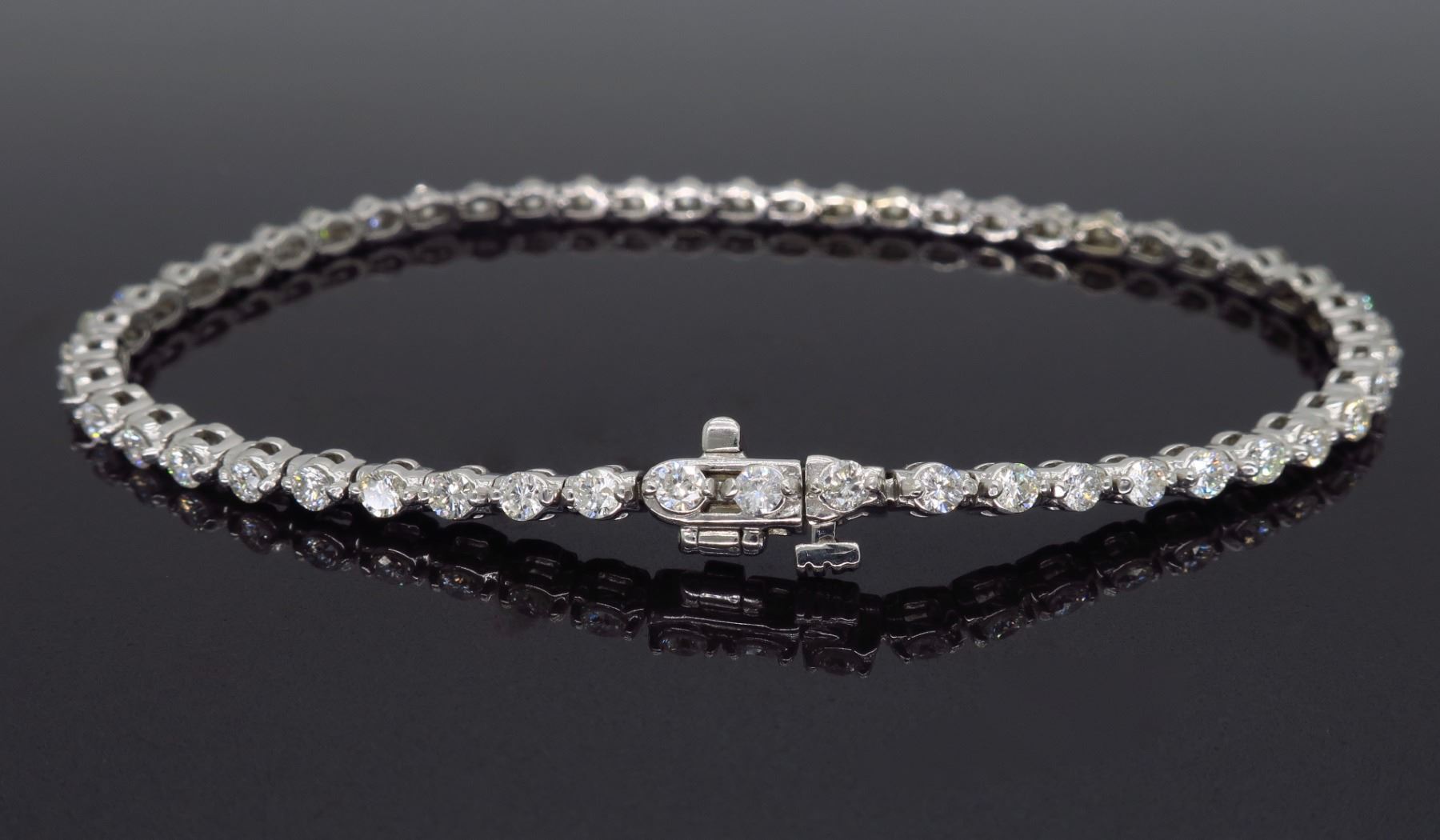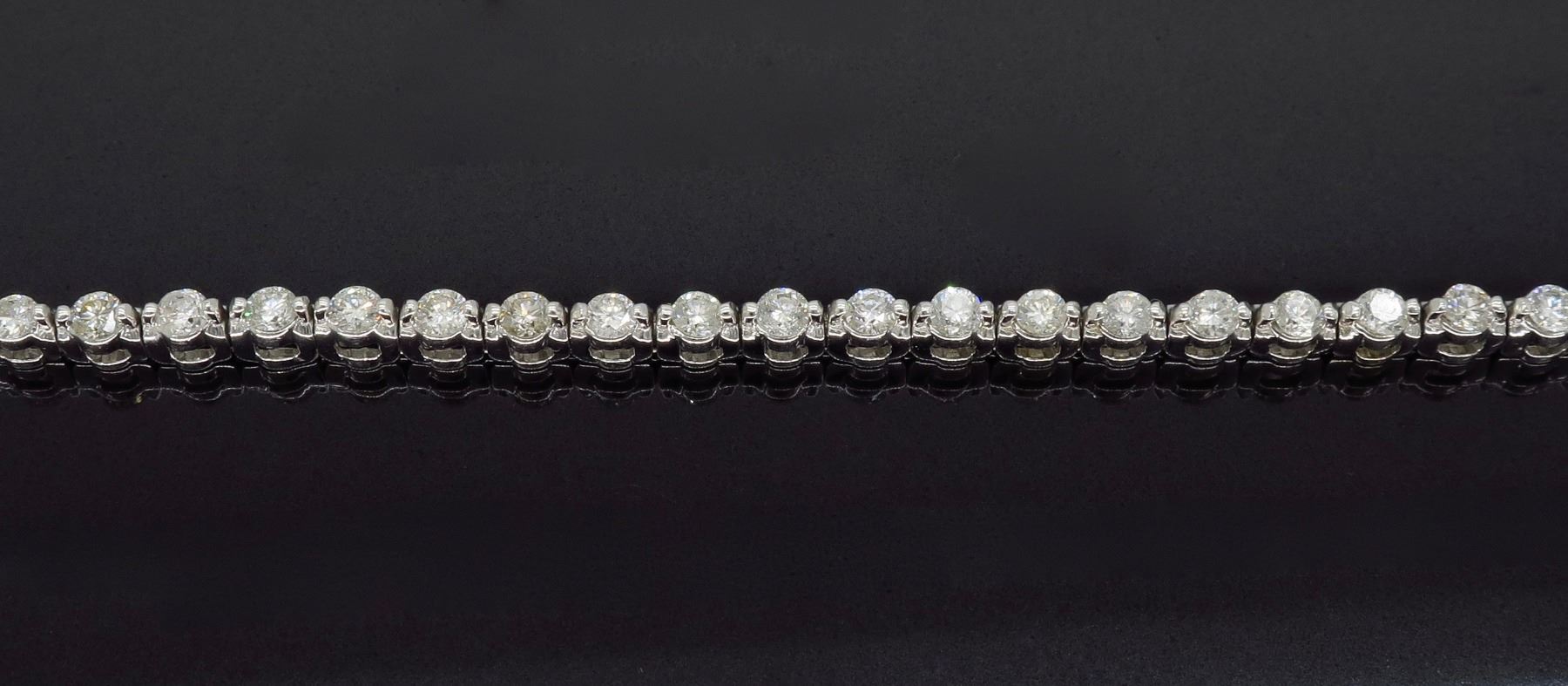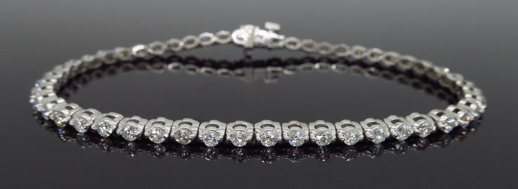 One 14KT White Gold 2.00ctw Diamond Bracelet. (51) Round Diamonds with a total weight of 2.00cts with a color of G-J and clarity of SI-2 to I-1. Total weight of this bracelet is 7.7 grams. Length of this bracelet is 7 inches.