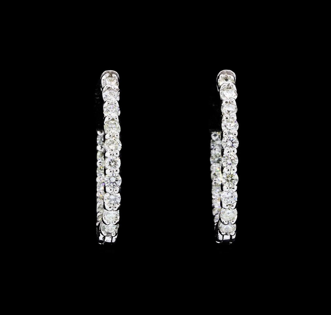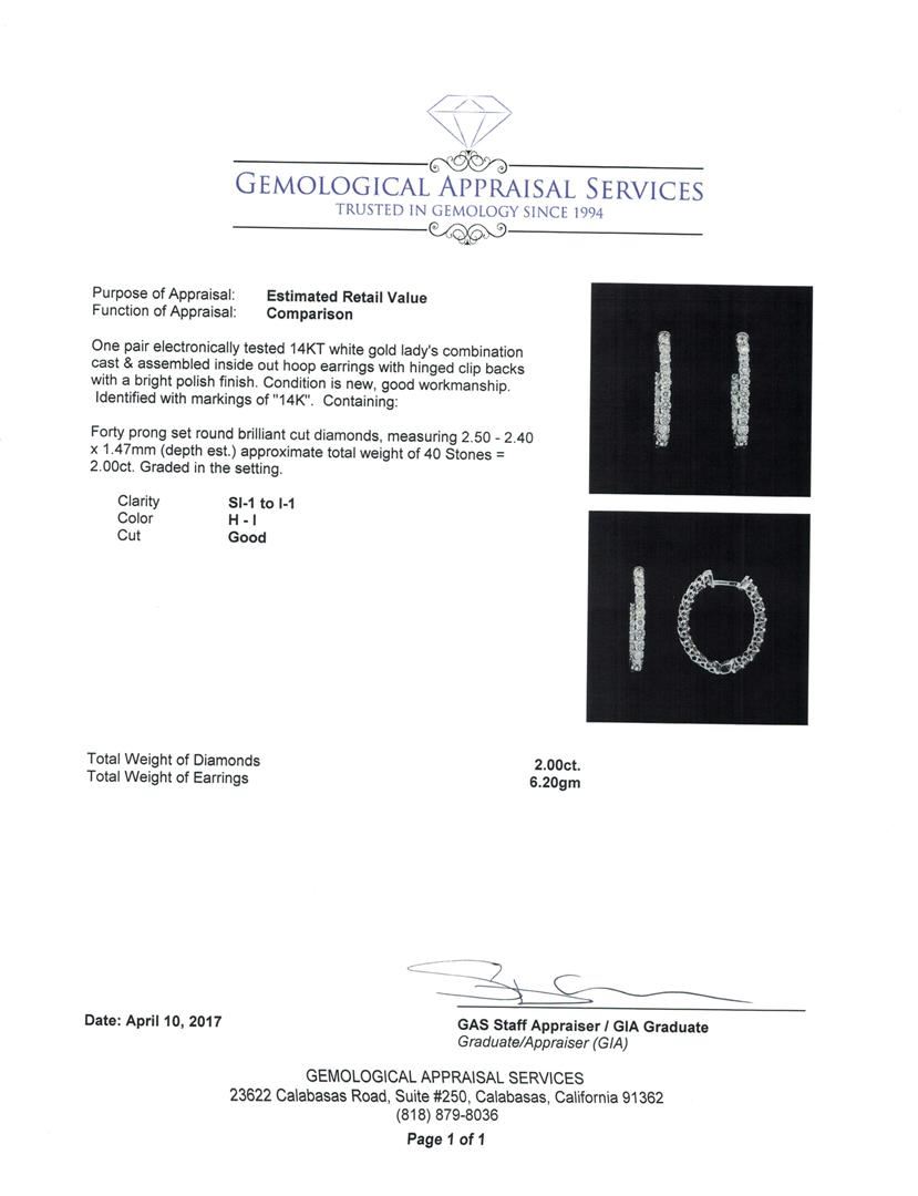 One pair electronically tested 14KT white gold lady's combination cast & assembled inside out hoop earrings with hinged clip backs with a bright polish finish. Identified with markings of "14K". Condition is new, good workmanship. Containing: Forty prong set round brilliant cut diamonds, measuring 2.50 - 2.40 x 1.47mm (depth est.) approximate total weight of 40 Stones = 2.00ct. Graded in the setting. Color H - I Clarity SI-1 to I-1 Cut Good. Total Weight of Diamonds 2.00ct. Total Weight of Earrings 6.20gm. GAS Appraised.