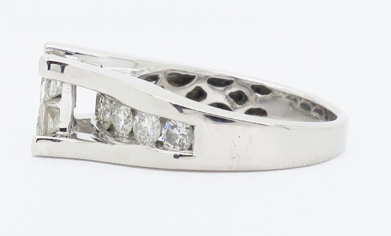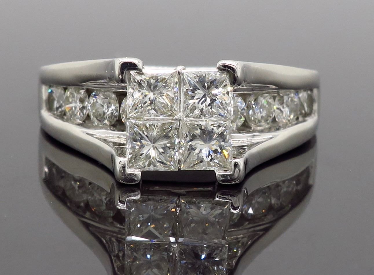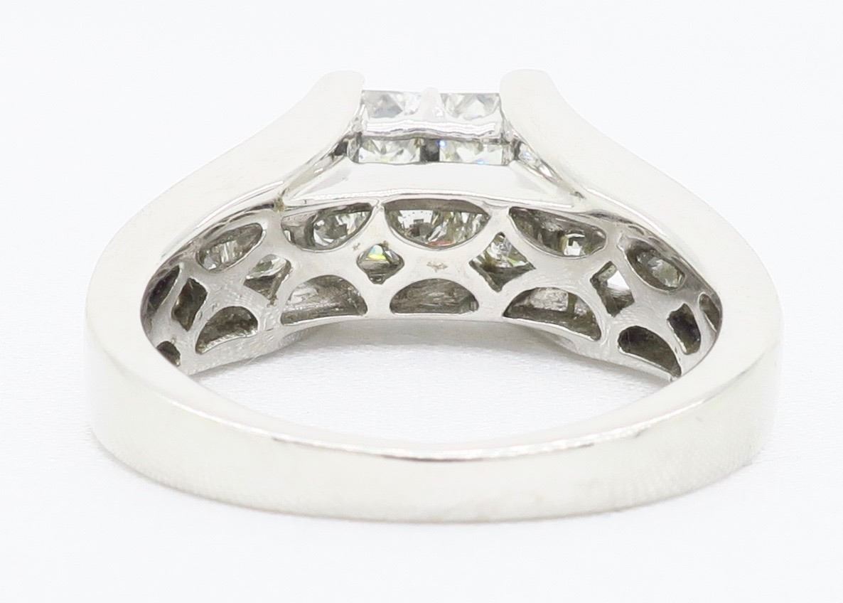 One 14KT White Gold 2.00ctw Diamond Ring. (4) Princess cut and (9) Round Diamonds with a total weight of 2.00cts with a color of G-I and clarity of SI-2. Total weight of this ring is 6.5 grams. Ring size is 5.5.