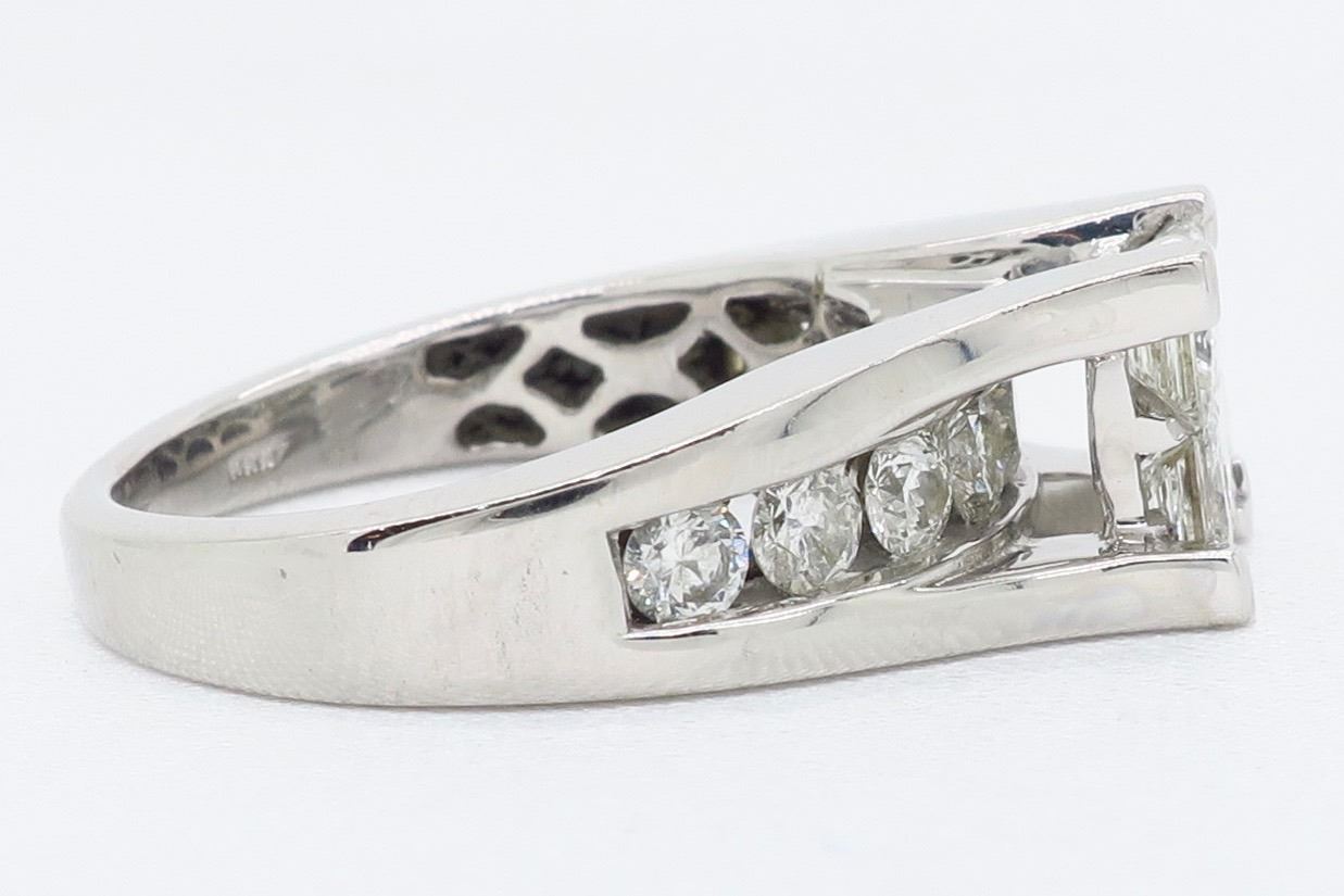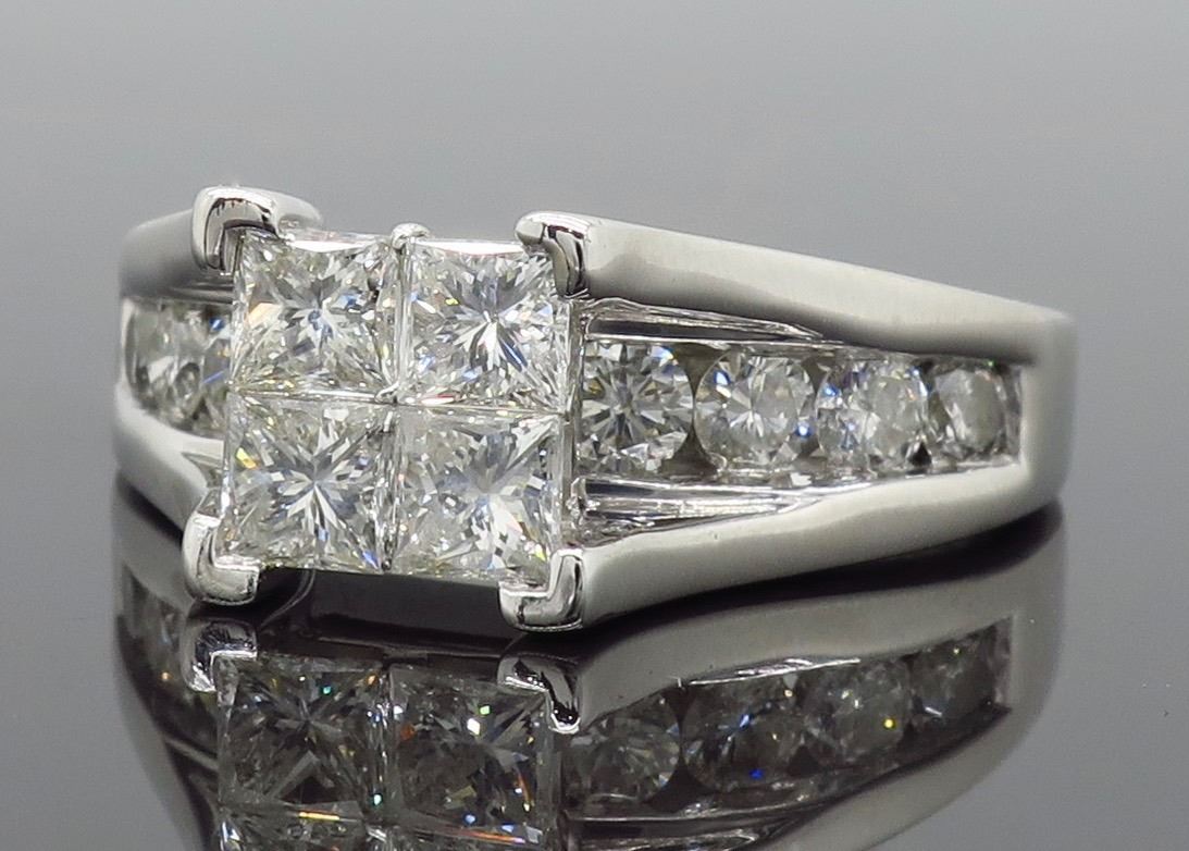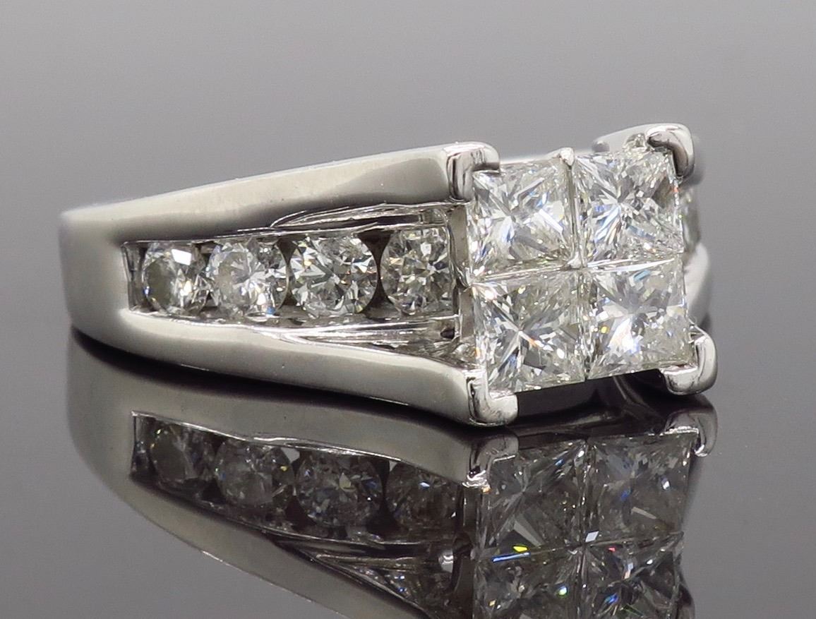 One 14KT White Gold 2.00ctw Diamond Ring. (4) Princess cut and (9) Round Diamonds with a total weight of 2.00cts with a color of G-I and clarity of SI-2. Total weight of this ring is 6.5 grams. Ring size is 5.5.