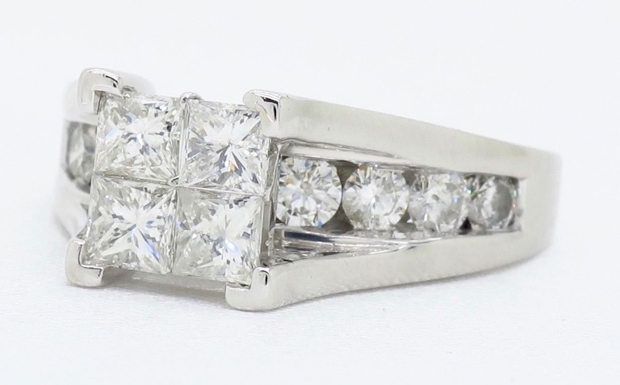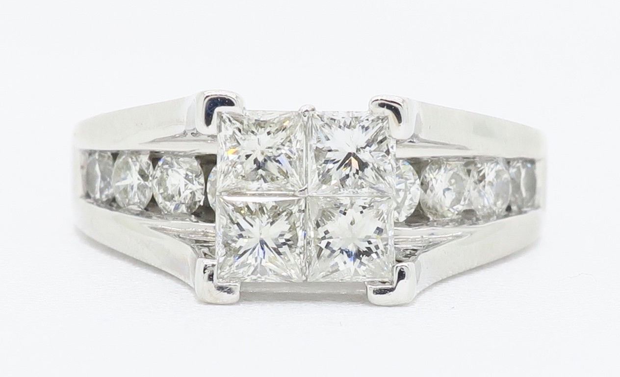 One 14KT White Gold 2.00ctw Diamond Ring. (4) Princess cut and (9) Round Diamonds with a total weight of 2.00cts with a color of G-I and clarity of SI-2. Total weight of this ring is 6.5 grams. Ring size is 5.5.