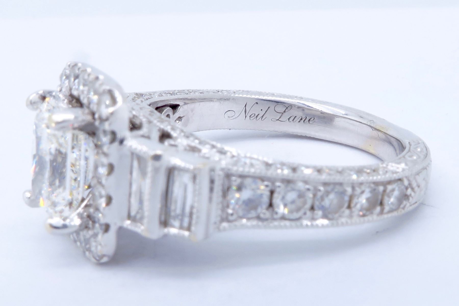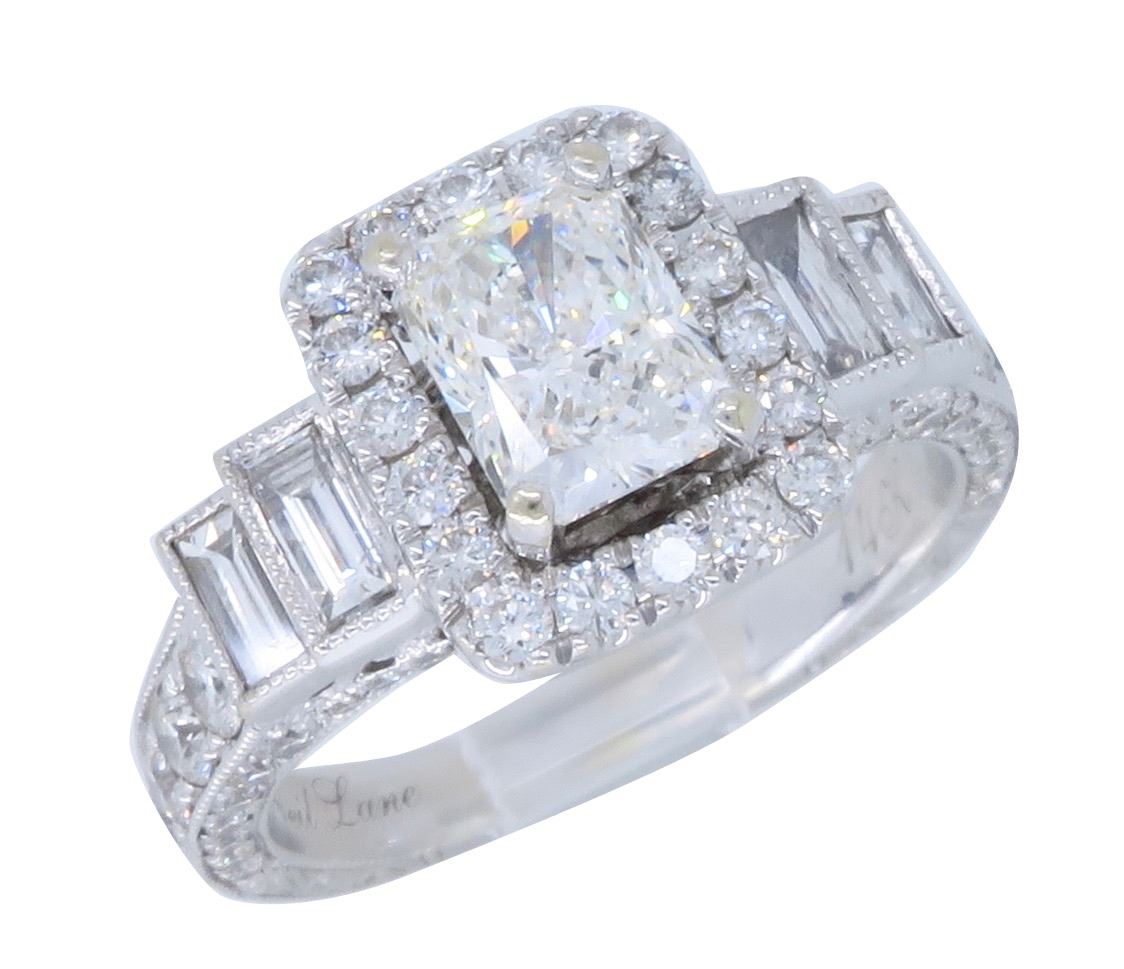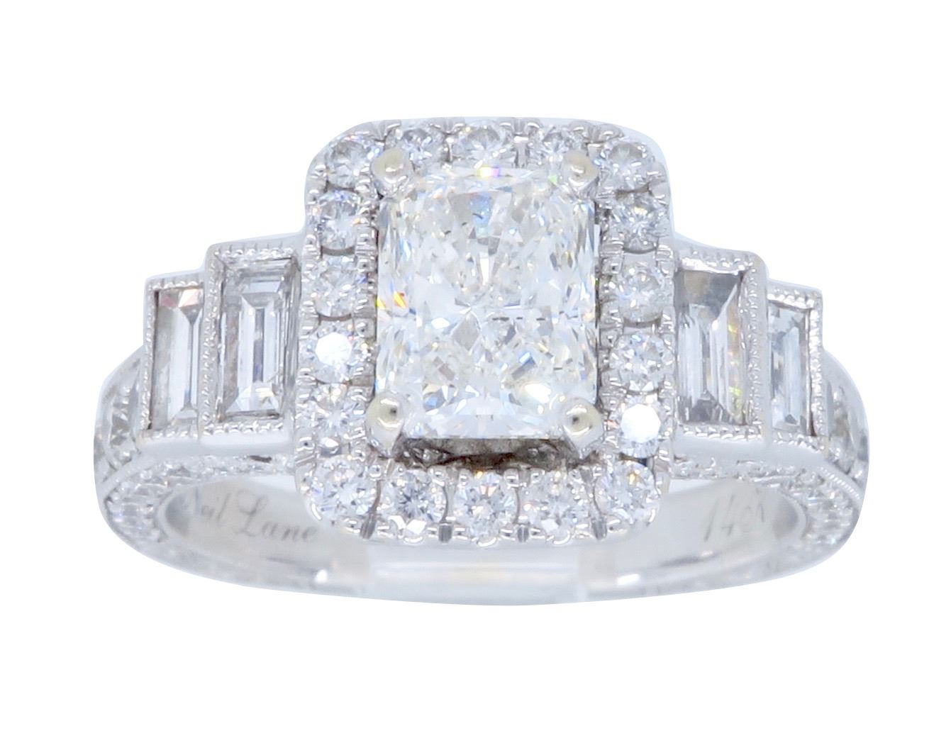 One 14KT White Gold 2.00ctw Neal Lane Diamond Ring. (1) Radiant cut Diamond with a total weight of 1.00cts with a color of I-J and clarity of SI-2. Round and baguette side diamonds with a total weight of 1.00cts. Total weight of this ring is 5.4 grams. Ring size is 5.75.
