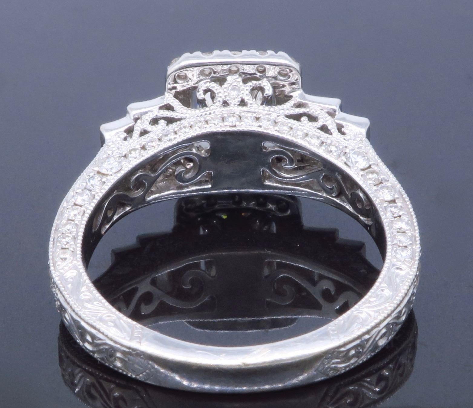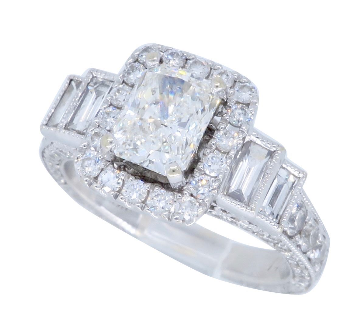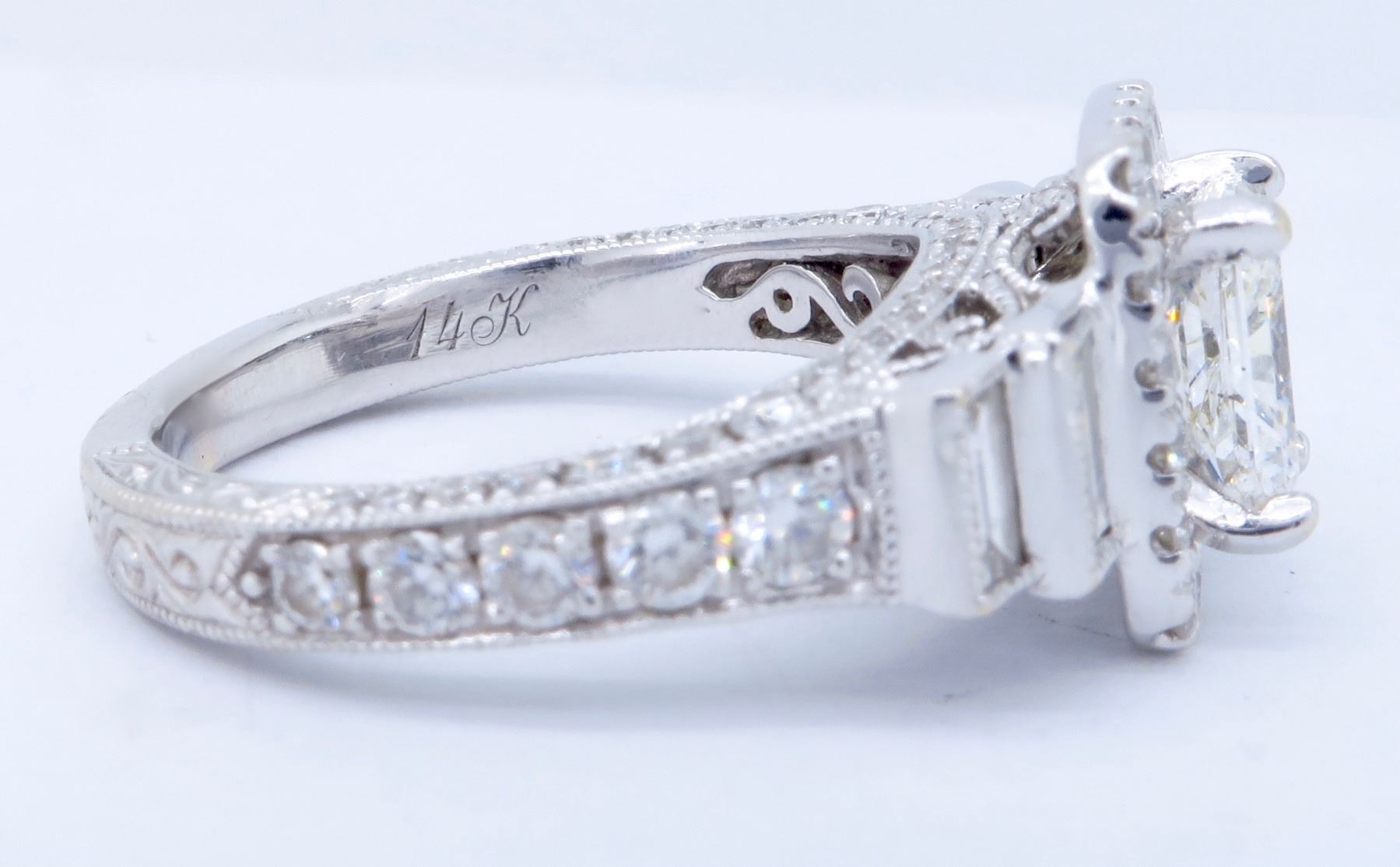 One 14KT White Gold 2.00ctw Neal Lane Diamond Ring. (1) Radiant cut Diamond with a total weight of 1.00cts with a color of I-J and clarity of SI-2. Round and baguette side diamonds with a total weight of 1.00cts. Total weight of this ring is 5.4 grams. Ring size is 5.75.