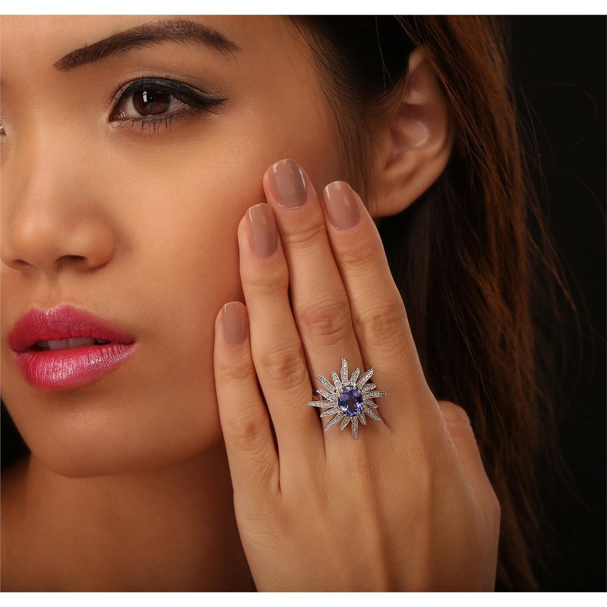 One electronically tested 14KT white gold ladies combination cast & assembled ring with a bright polish finish. Condition is new. Identified with markings of "14K". Containing: One prong set oval modified brilliant cut natural tanzanite, measuring 9.50 x 7.10 x 4.35mm, approximate weight of 2.01ct., clarity is eye clean, type I, medium, very slightly grayish, bluish violet color, (GIA bV 5/3), cut is good. Fifty-Six prong set round brilliant cut diamonds, measuring 1.00 - 1.00 x 0.60mm (depth est.) approximate total weight of 56 Stones = 0.20ct. Clarity: I-1 to I-2. Color: H - I, Cut is Good. Colored gemstones are presumed to have been subjected to commonly used enhancement processes. All diamonds and colored gemstones are graded in the mounting, unless otherwise stated. Total Weight of Colored Stones 2.01ct. Total Weight of Diamonds 0.20ct. Total Weight of Ring 5.20 grams. GGL Appraised at $4,805.00.