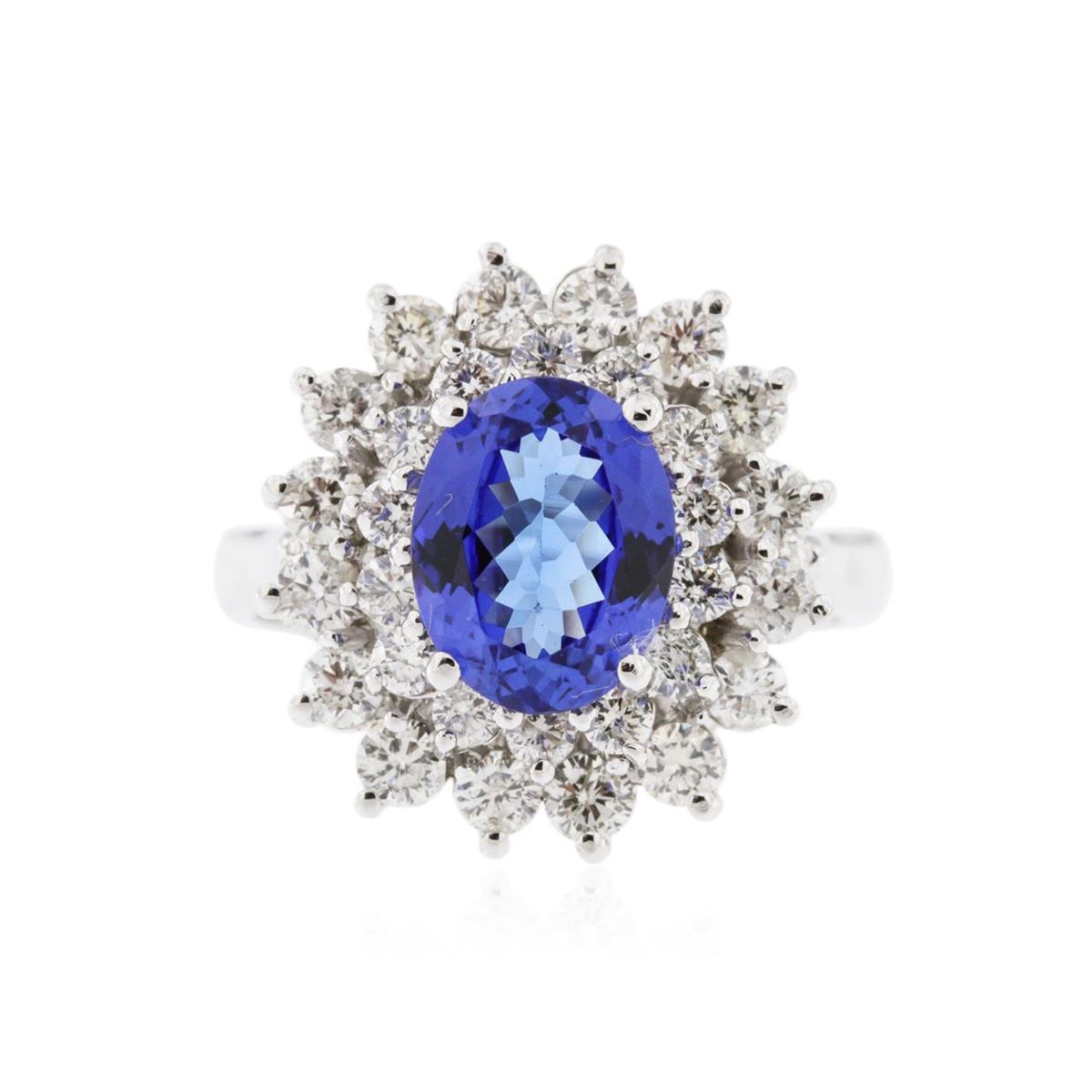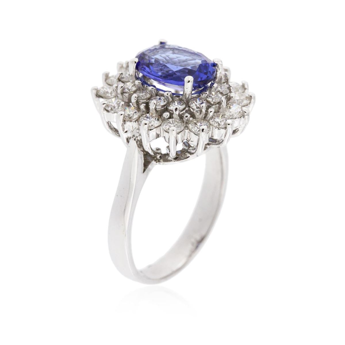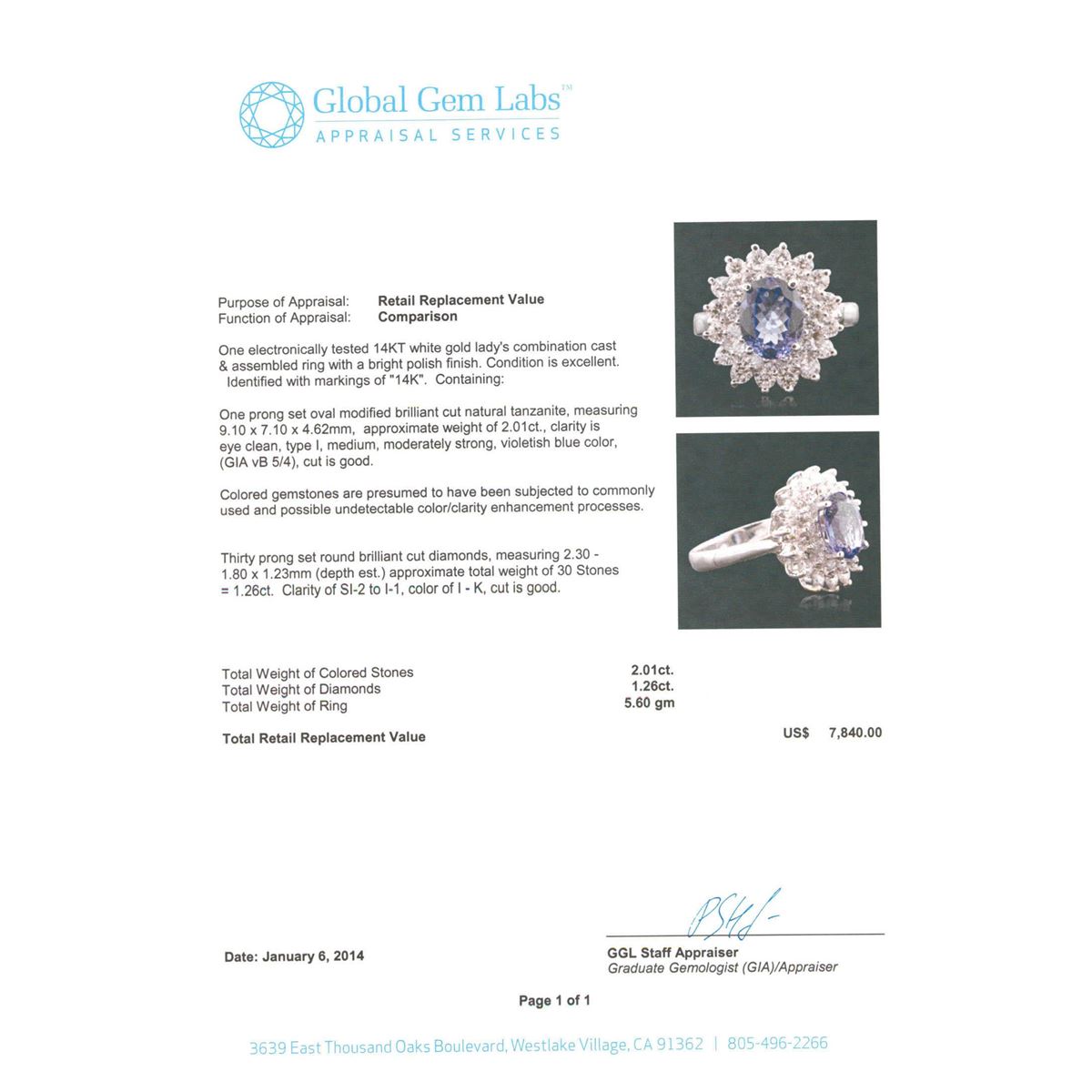 One electronically tested 14KT white gold Ladies combination cast & assembled ring with a bright polish finish. Identified with markings of "14K". Condition is excellent. Containing: One prong set oval modified brilliant cut natural tanzanite, measuring 9.10 x 7.10 x 4.62mm, approximate weight of 2.01ct., clarity is eye clean, type I, medium, moderately strong, violetish blue color, (GIA vB 5/4), cut is good. Colored gemstones are presumed to have been subjected to commonly used and possible undetectable color/clarity enhancement processes. Thirty prong set round brilliant cut diamonds, measuring 2.30 - 1.80 x 1.23mm (depth est.) approximate total weight of 30 Stones = 1.26ct. Clarity of SI-2 to I-1, Color of I - K, Cut is Good. Total Weight of Colored Stones 2.01ct. Total Weight of Diamonds 1.26ct. Total Weight of Ring 5.60gm. GGL Appraised at $7,840.00.