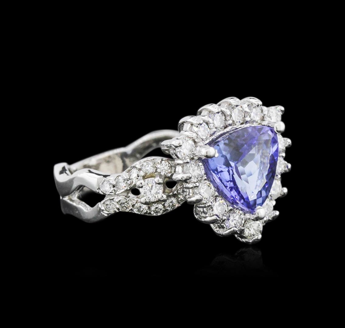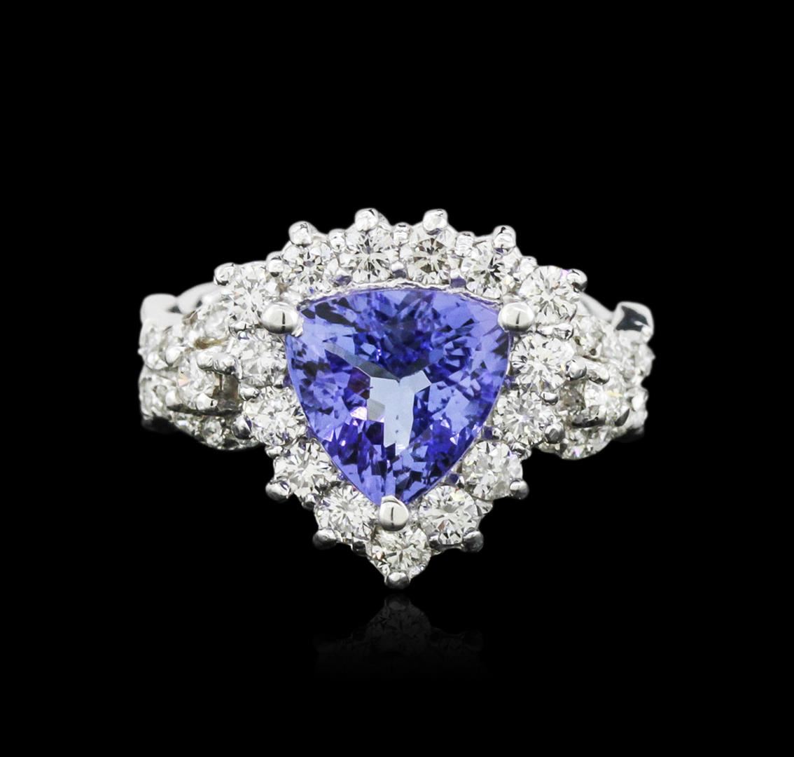 One electronically tested 14KT white gold ladies cast tanzanite and diamond ring with a bright polish finish. Condition is new. Containing: One prong set triangle modified mixed cut natural tanzanite, measuring 8.00 x 8.00 x 5.21mm, approximate weight of 2.01ct., clarity is eye clean, type I, medium light, very slightly grayish, violet color, (GIA V 4/3), cut is good. Thirty-Three prong set round brilliant cut diamonds, measuring 2.10 - 1.30 x 1.02mm (depth est.) approximate total weight of 33 Stones = 0.68ct. Clarity: SI-1 to SI-2. Color: H - I, Cut is Good. Colored gemstones are presumed to have been subjected to commonly used enhancement processes. All diamonds and colored gemstones are graded in the mounting, unless otherwise stated. Total Weight of Colored Stones 2.01ct. Total Weight of Diamonds 0.68ct. Total Weight of Ring 5.10 grams. GGL Appraised at $4,165.00.