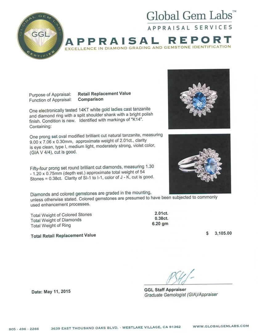 One electronically tested 14KT white gold ladies cast tanzanite and diamond ring with a split shoulder shank with a bright polish finish. Identified with markings of "K14". Condition is new. Containing: One prong set oval modified brilliant cut natural tanzanite, measuring 9.00 x 7.06 x 0.30mm, approximate weight of 2.01ct., clarity is eye clean, type I, medium light, moderately strong, violet color, (GIA V 4/4), cut is good. Fifty-Four prong set round brilliant cut diamonds, measuring 1.30 - 1.20 x 0.75mm (depth est.) approximate total weight of 54 Stones = 0.38ct. Clarity: SI-1 to I-1. Color: J - K, Cut is Good. Diamonds and colored gemstones are graded in the mounting, unless otherwise stated. Colored gemstones are presumed to have been subjected to commonly used enhancement processes. Total Weight of Colored Stones 2.01ct. Total Weight of Diamonds 0.38ct. Total Weight of Ring 6.20 grams. GGL Appraised at $3,105.00.