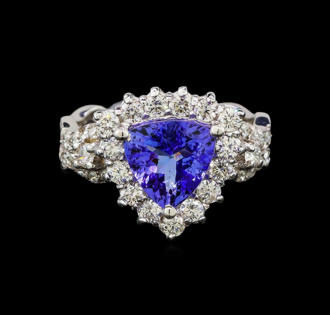 One electronically tested 14KT white gold ladies cast tanzanite and diamond ring with a bright polish finish. Condition is new. Containing: One prong set triangle modified mixed cut natural tanzanite, measuring 8.00 x 8.00 x 5.21mm, approximate weight of 2.01ct., clarity is eye clean, type I, medium light, very slightly grayish, violet color, (GIA V 4/3), cut is good. Thirty-Three prong set round brilliant cut diamonds, measuring 2.10 - 1.30 x 1.02mm (depth est.) approximate total weight of 33 Stones = 0.68ct. Clarity: SI-1 to SI-2. Color: H - I, Cut is Good. Colored gemstones are presumed to have been subjected to commonly used enhancement processes. All diamonds and colored gemstones are graded in the mounting, unless otherwise stated. Total Weight of Colored Stones 2.01ct. Total Weight of Diamonds 0.68ct. Total Weight of Ring 5.10 grams. GGL Appraised at $4,165.00.