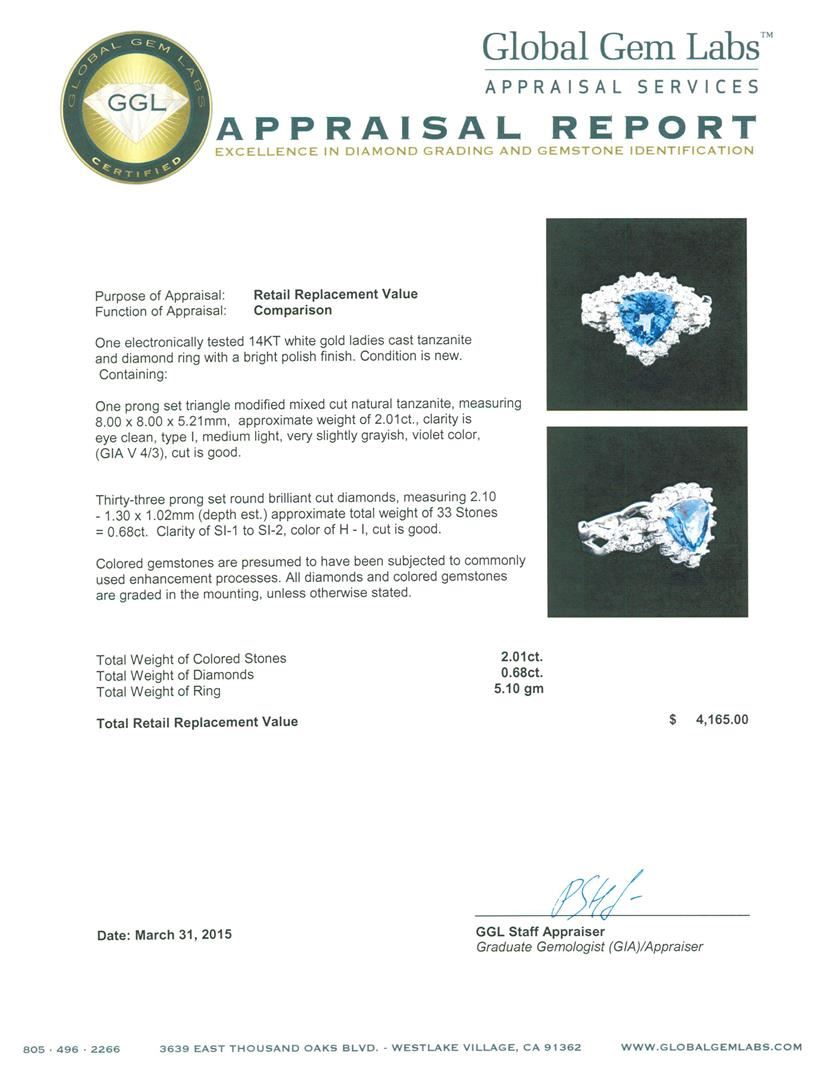 One electronically tested 14KT white gold ladies cast tanzanite and diamond ring with a bright polish finish. Condition is new. Containing: One prong set triangle modified mixed cut natural tanzanite, measuring 8.00 x 8.00 x 5.21mm, approximate weight of 2.01ct., clarity is eye clean, type I, medium light, very slightly grayish, violet color, (GIA V 4/3), cut is good. Thirty-Three prong set round brilliant cut diamonds, measuring 2.10 - 1.30 x 1.02mm (depth est.) approximate total weight of 33 Stones = 0.68ct. Clarity: SI-1 to SI-2. Color: H - I, Cut is Good. Colored gemstones are presumed to have been subjected to commonly used enhancement processes. All diamonds and colored gemstones are graded in the mounting, unless otherwise stated. Total Weight of Colored Stones 2.01ct. Total Weight of Diamonds 0.68ct. Total Weight of Ring 5.10 grams. GGL Appraised at $4,165.00.