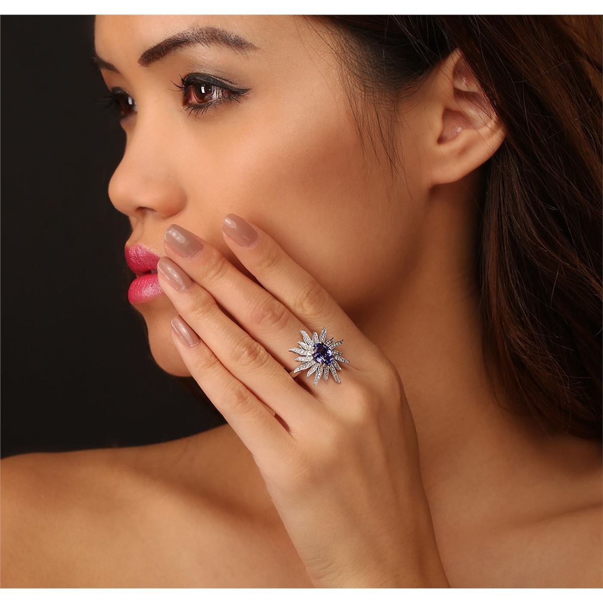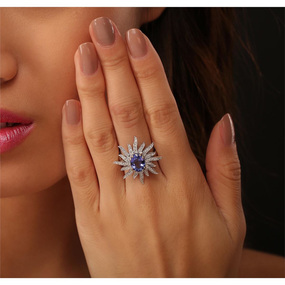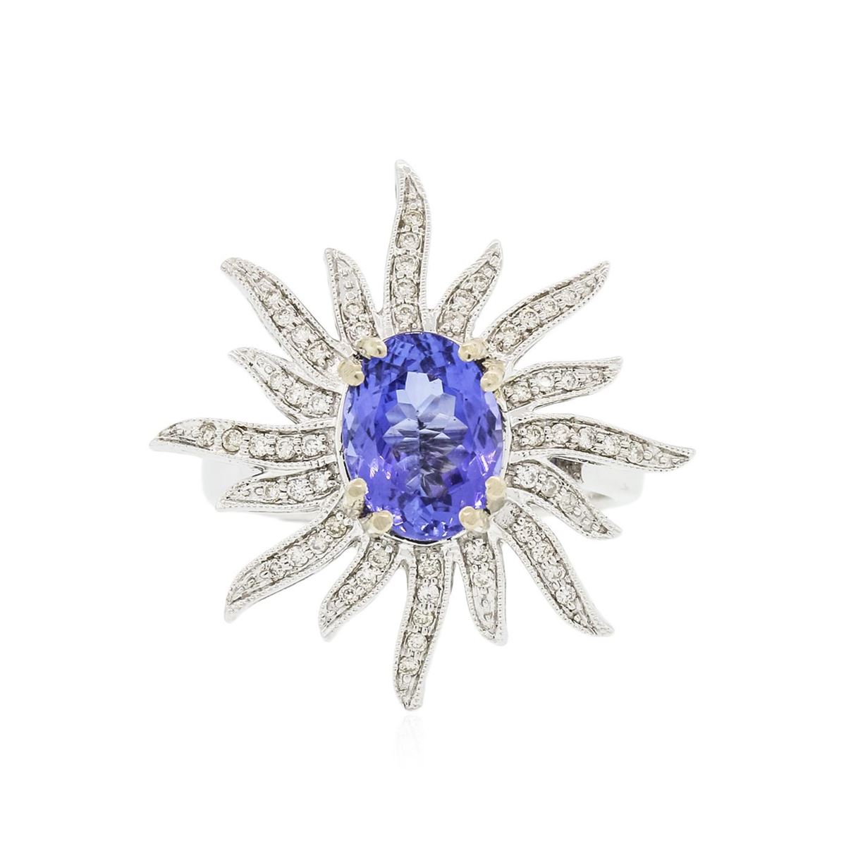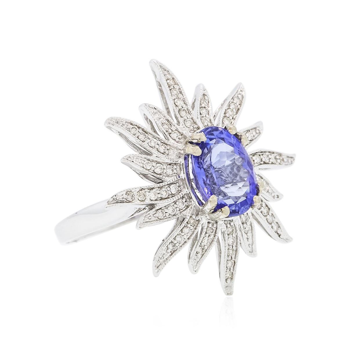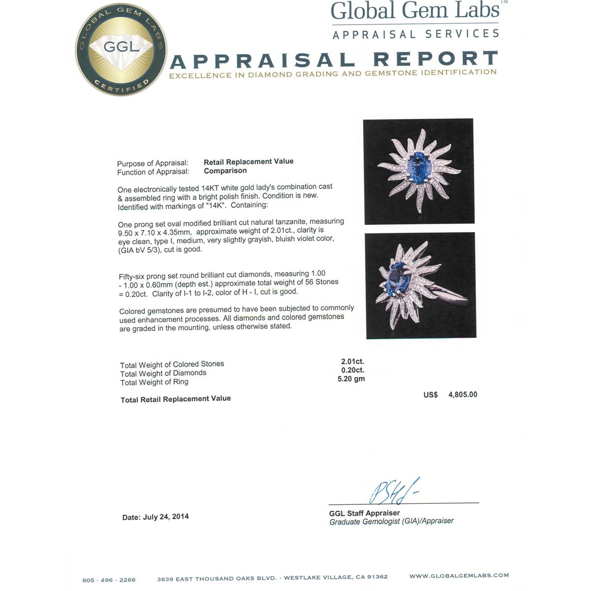 One electronically tested 14KT white gold ladies combination cast & assembled ring with a bright polish finish. Condition is new. Identified with markings of "14K". Containing: One prong set oval modified brilliant cut natural tanzanite, measuring 9.50 x 7.10 x 4.35mm, approximate weight of 2.01ct., clarity is eye clean, type I, medium, very slightly grayish, bluish violet color, (GIA bV 5/3), cut is good. Fifty-Six prong set round brilliant cut diamonds, measuring 1.00 - 1.00 x 0.60mm (depth est.) approximate total weight of 56 Stones = 0.20ct. Clarity: I-1 to I-2. Color: H - I, Cut is Good. Colored gemstones are presumed to have been subjected to commonly used enhancement processes. All diamonds and colored gemstones are graded in the mounting, unless otherwise stated. Total Weight of Colored Stones 2.01ct. Total Weight of Diamonds 0.20ct. Total Weight of Ring 5.20 grams. GGL Appraised at $4,805.00.