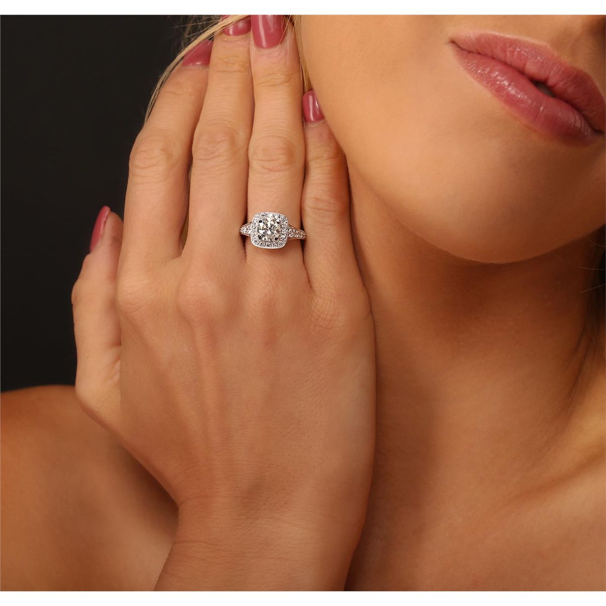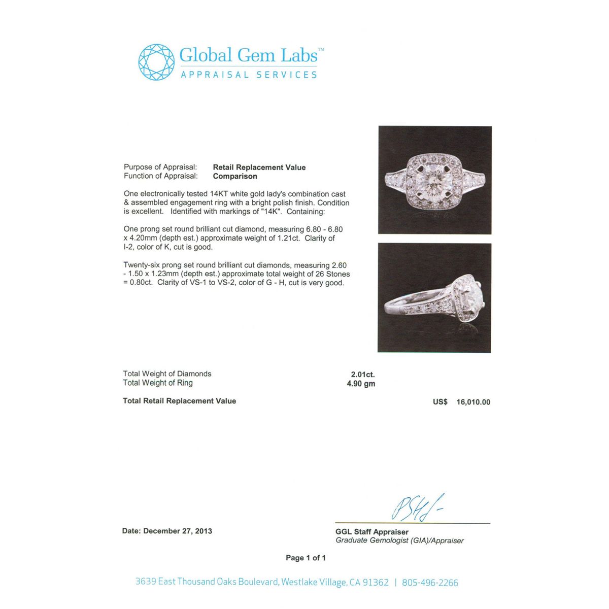 One electronically tested 14KT white gold Ladies combination cast & assembled engagement ring with a bright polish finish. Identified with markings of "14K". Condition is excellent. Containing: One prong set round brilliant cut diamond, measuring 6.80 - 6.80 x 4.20mm (depth est.) approximate weight of 1.21ct. Clarity of I-2, Color of K, Cut is Good. Twenty-Six prong set round brilliant cut diamonds, measuring 2.60 - 1.50 x 1.23mm (depth est.) approximate total weight of 26 Stones = 0.80ct. Clarity of VS-1 to VS-2, Color of G - H, Cut is Very Good. Total Weight of Diamonds 2.01ct. Total Weight of Ring 4.90gm. GGL Appraised at $16,010.00.