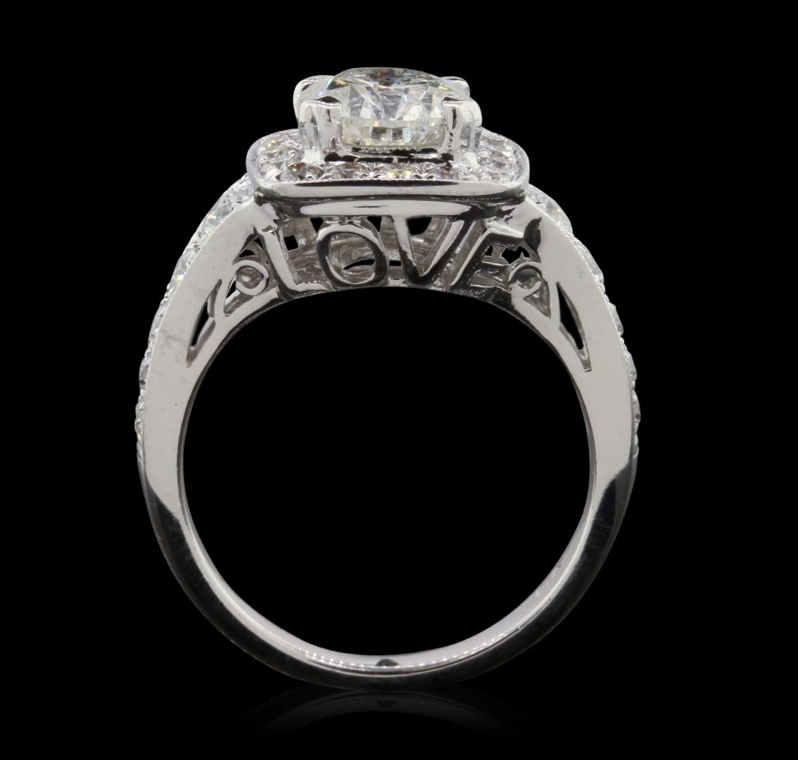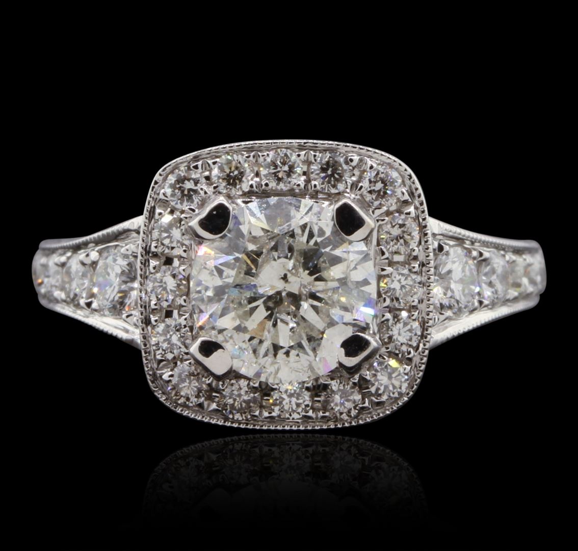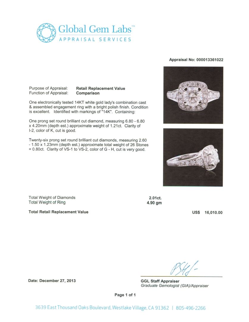 One electronically tested 14KT white gold Ladies combination cast & assembled engagement ring with a bright polish finish. Identified with markings of "14K". Condition is excellent. Containing: One prong set round brilliant cut diamond, measuring 6.80 - 6.80 x 4.20mm (depth est.) approximate weight of 1.21ct. Clarity of I-2, Color of K, Cut is Good. Twenty-Six prong set round brilliant cut diamonds, measuring 2.60 - 1.50 x 1.23mm (depth est.) approximate total weight of 26 Stones = 0.80ct. Clarity of VS-1 to VS-2, Color of G - H, Cut is Very Good. Total Weight of Diamonds 2.01ct. Total Weight of Ring 4.90gm. GGL Appraised at $16,010.00.
