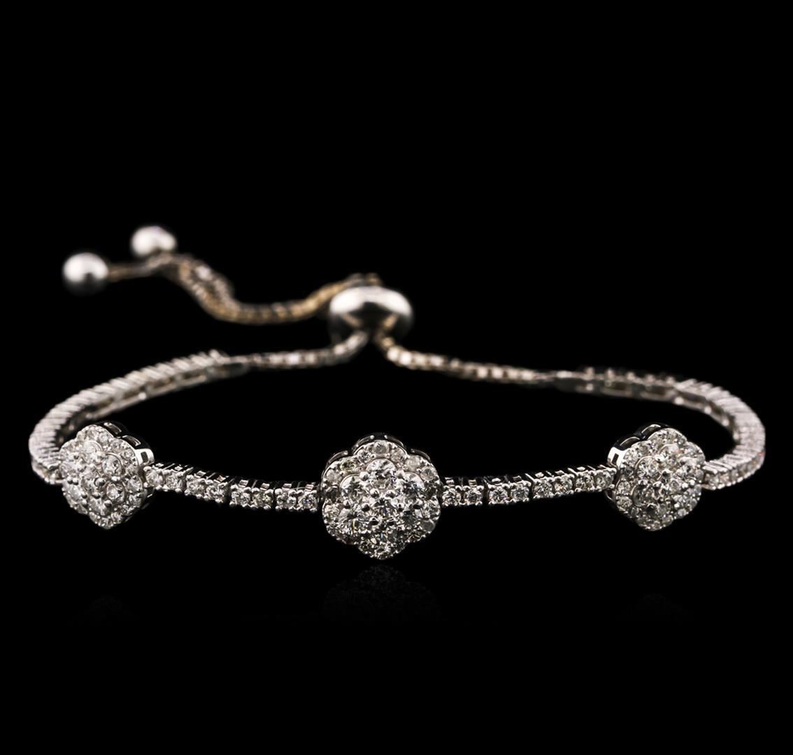 One electronically tested 14KT white gold ladies cast diamond bracelet with a bright polish finish. Measurements: 6" in length Identified with markings of "14K". Condition is new. Containing: One Hundred Thirty-Three prong set round brilliant cut diamonds, measuring 2.00 - 1.50 x 1.05mm (depth est.) approximate total weight of 133 Stones = 2.02ct. Clarity: SI-2 to I-2. Color: H - I, Cut is Good. Diamonds are graded in the mounting, unless otherwise stated. Total Weight of Diamonds 2.02ct. Total Weight of Bracelet 8.40 grams. GGL Appraised.