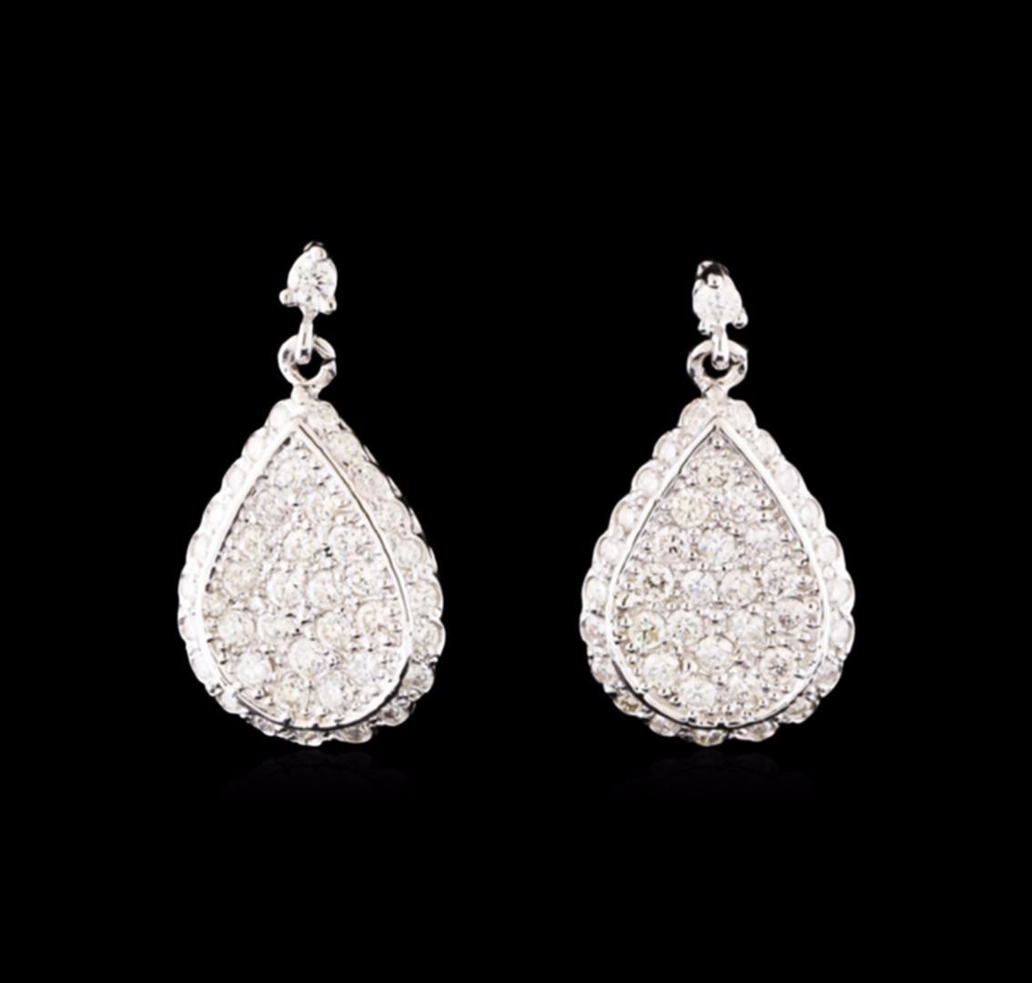 One pair electronically tested 14KT white gold ladies combination cast & assembled dangle diamond earrings with friction posts with a bright polish finish. Condition is new. Containing: Forty-Four prong set round brilliant cut diamonds, measuring 1.50 - 1.50 x 0.90mm (depth est.) approximate total weight of 44 Stones = 0.54ct. Clarity: SI-1 to I-1. Color: H - I, Cut is Good. Thirty-Eight prong set round brilliant cut diamonds, measuring 2.20 - 2.20 x 1.32mm (depth est.) approximate total weight of 38 Stones = 1.48ct. Clarity: SI-1 to I-1. Color: J - K, Cut is Good. All diamonds are graded in the mounting, unless otherwise stated. Total Weight of Diamonds 2.02ct. Total Weight of Earrings 8.40 grams. GGL Appraised at $6,740.00.