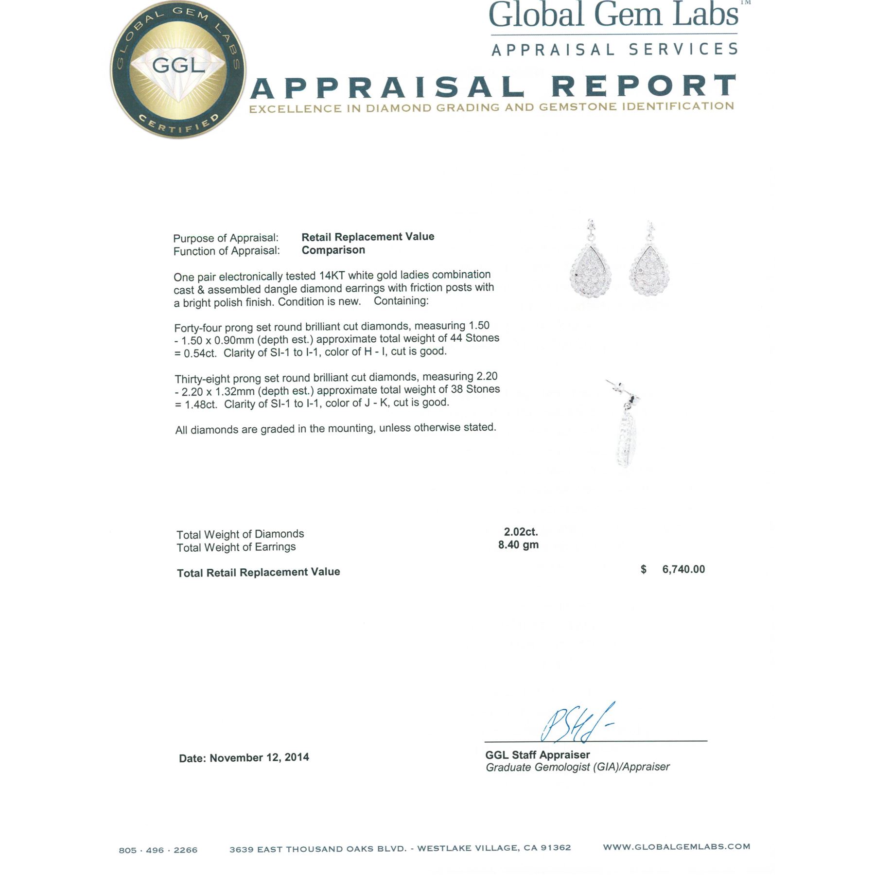 One pair electronically tested 14KT white gold ladies combination cast & assembled dangle diamond earrings with friction posts with a bright polish finish. Condition is new. Containing: Forty-Four prong set round brilliant cut diamonds, measuring 1.50 - 1.50 x 0.90mm (depth est.) approximate total weight of 44 Stones = 0.54ct. Clarity: SI-1 to I-1. Color: H - I, Cut is Good. Thirty-Eight prong set round brilliant cut diamonds, measuring 2.20 - 2.20 x 1.32mm (depth est.) approximate total weight of 38 Stones = 1.48ct. Clarity: SI-1 to I-1. Color: J - K, Cut is Good. All diamonds are graded in the mounting, unless otherwise stated. Total Weight of Diamonds 2.02ct. Total Weight of Earrings 8.40 grams. GGL Appraised at $6,740.00.