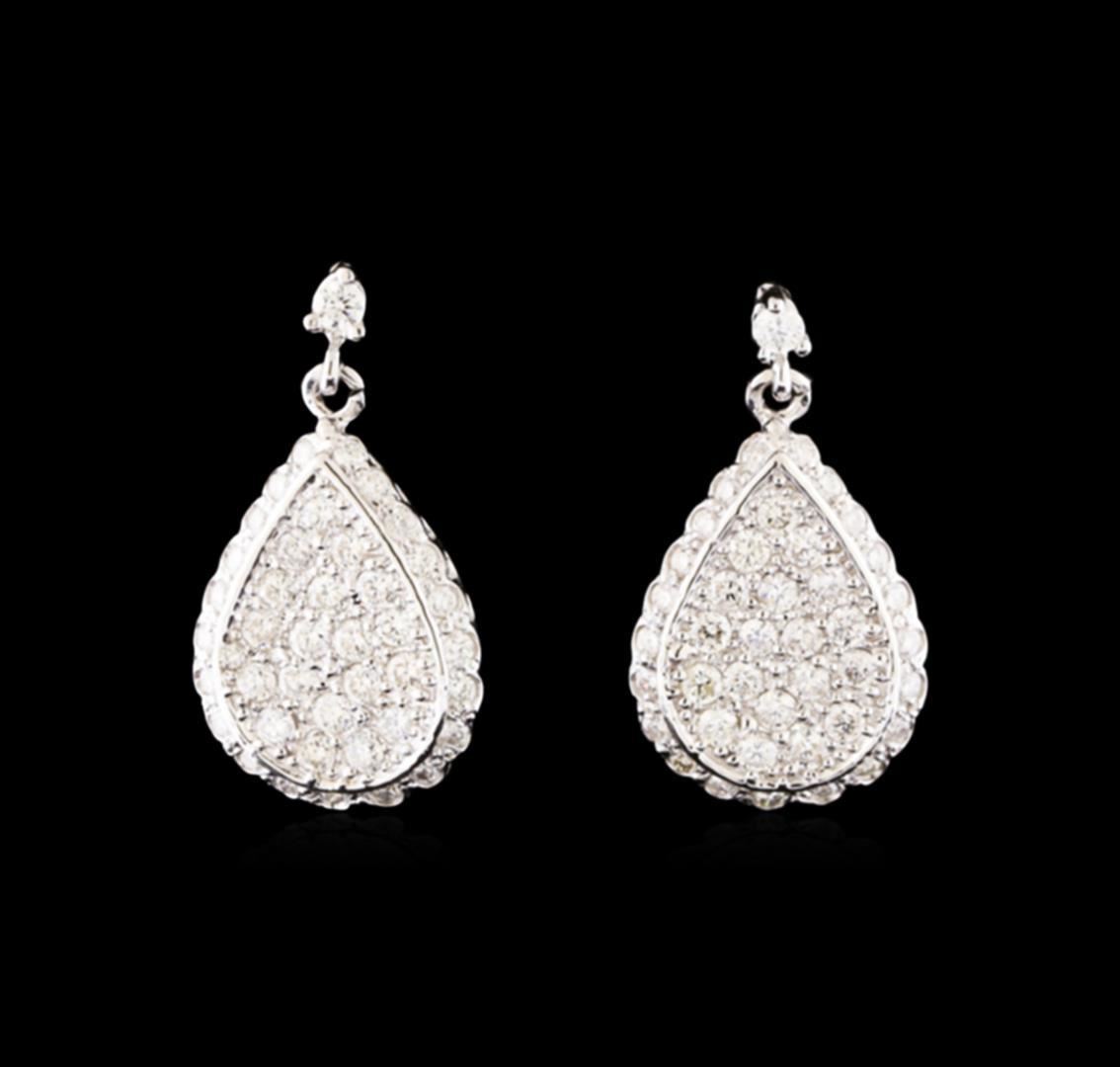 One pair electronically tested 14KT white gold ladies combination cast & assembled dangle diamond earrings with friction posts with a bright polish finish. Condition is new. Containing: Forty-Four prong set round brilliant cut diamonds, measuring 1.50 - 1.50 x 0.90mm (depth est.) approximate total weight of 44 Stones = 0.54ct. Clarity: SI-1 to I-1. Color: H - I, Cut is Good. Thirty-Eight prong set round brilliant cut diamonds, measuring 2.20 - 2.20 x 1.32mm (depth est.) approximate total weight of 38 Stones = 1.48ct. Clarity: SI-1 to I-1. Color: J - K, Cut is Good. All diamonds are graded in the mounting, unless otherwise stated. Total Weight of Diamonds 2.02ct. Total Weight of Earrings 8.40 grams. GGL Appraised.