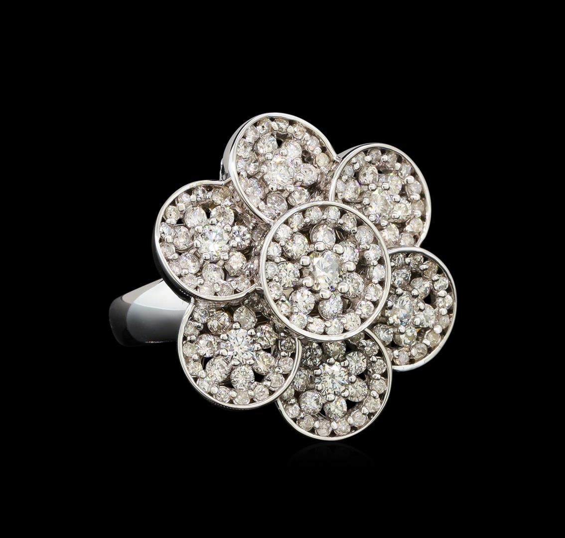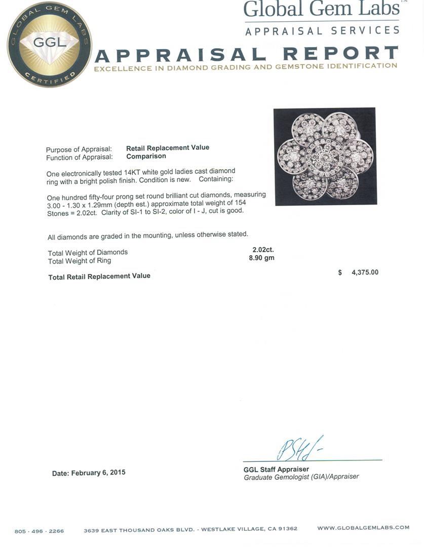 One electronically tested 14KT white gold ladies cast diamond ring with a bright polish finish. Condition is new. Containing: One Hundred Fifty-Four prong set round brilliant cut diamonds, measuring 3.00 - 1.30 x 1.29mm (depth est.) approximate. Total Weight of 154 Stones = 2.02ct. Clarity: SI-1 to SI-2. Color: I - J, Cut is Good. All diamonds are graded in the mounting, unless otherwise stated. Total Weight of Diamonds 2.02ct. Total Weight of Ring 8.90 grams. GGL Appraised.