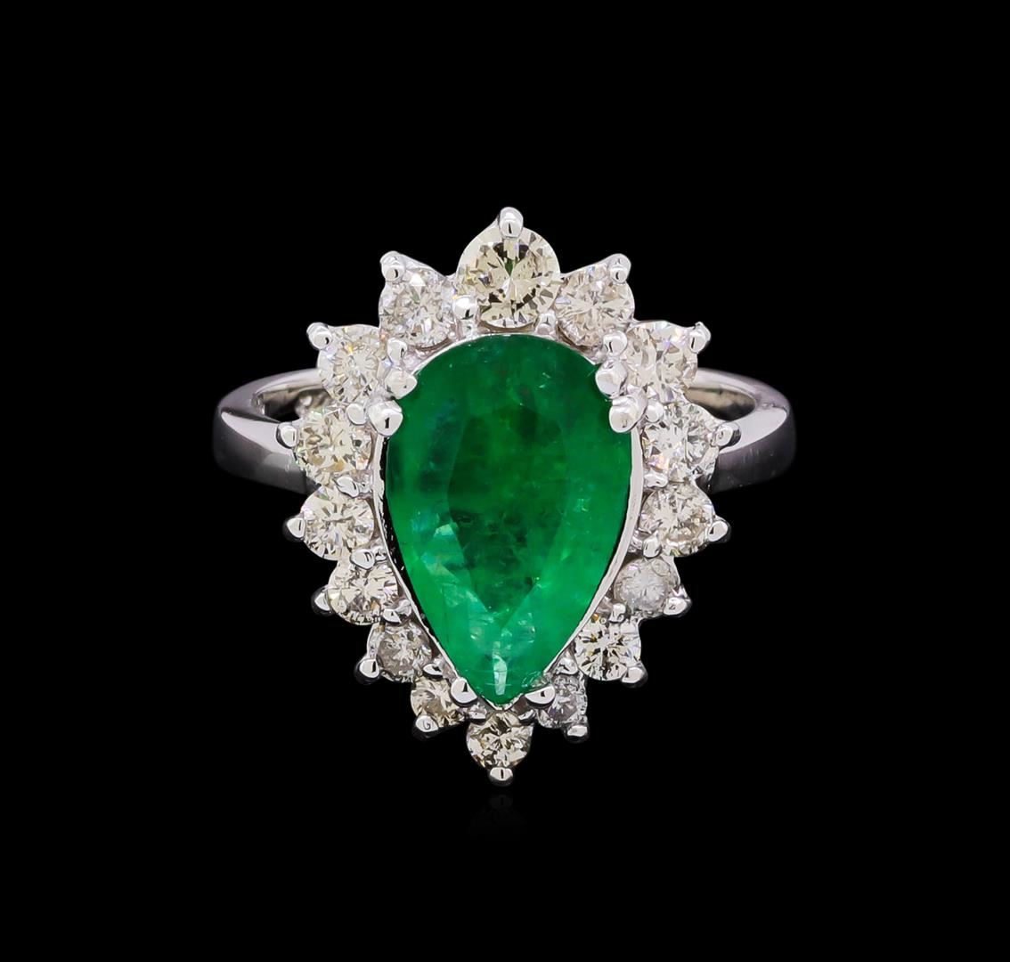 One electronically tested 14KT white gold ladies cast emerald and diamond ring with a bright polish finish. The featured emerald is set within a diamond bezel, completed by a two and one-half millimeter wide band. Identified with markings of "K14". Condition is new, good workmanship. Containing: One prong set pear mixed cut natural emerald, measuring 12.30 x 8.00 x 3.50mm, 8%. bulge factor, approximate weight of 2.02ct., clarity is heavily included, type III, medium, very slightly grayish, very slightly bluish green color, (GIA vslbG 5/3), cut is good. Transmitting light with a minimum of distortion, transparent to translucent. Naturally occurring internal & external characteristics are present. Indications of oil residue. Graded in the setting. Sixteen prong set round brilliant cut diamonds, measuring 3.40 - 2.20 x 1.68mm (depth est.) approximate. Total Weight of 16 Stones = 1.02ct. Graded in the setting. Clarity: SI-2 to I-1 . Color: G - I. Total Weight of Colored Stones 2.02ct. Total Weight of Diamonds 1.02ct. AIG Appraised at $5,025.00.