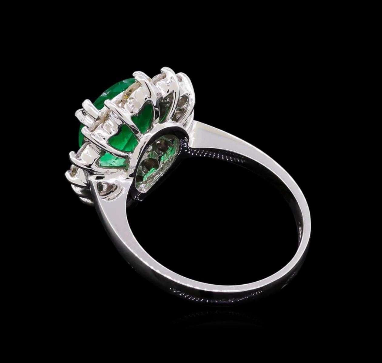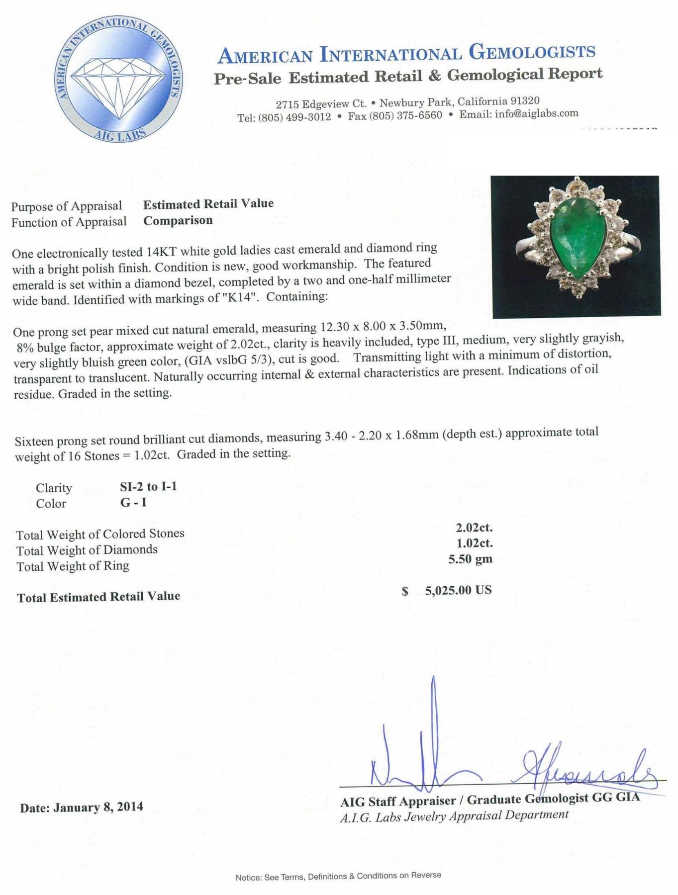 One electronically tested 14KT white gold ladies cast emerald and diamond ring with a bright polish finish. The featured emerald is set within a diamond bezel, completed by a two and one-half millimeter wide band. Identified with markings of "K14". Condition is new, good workmanship. Containing: One prong set pear mixed cut natural emerald, measuring 12.30 x 8.00 x 3.50mm, 8%. bulge factor, approximate weight of 2.02ct., clarity is heavily included, type III, medium, very slightly grayish, very slightly bluish green color, (GIA vslbG 5/3), cut is good. Transmitting light with a minimum of distortion, transparent to translucent. Naturally occurring internal & external characteristics are present. Indications of oil residue. Graded in the setting. Sixteen prong set round brilliant cut diamonds, measuring 3.40 - 2.20 x 1.68mm (depth est.) approximate. Total Weight of 16 Stones = 1.02ct. Graded in the setting. Clarity: SI-2 to I-1 . Color: G - I. Total Weight of Colored Stones 2.02ct. Total Weight of Diamonds 1.02ct. AIG Appraised.