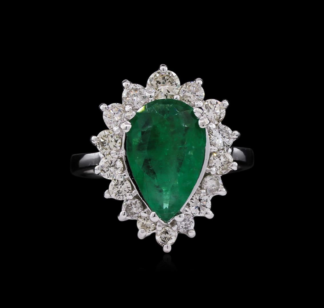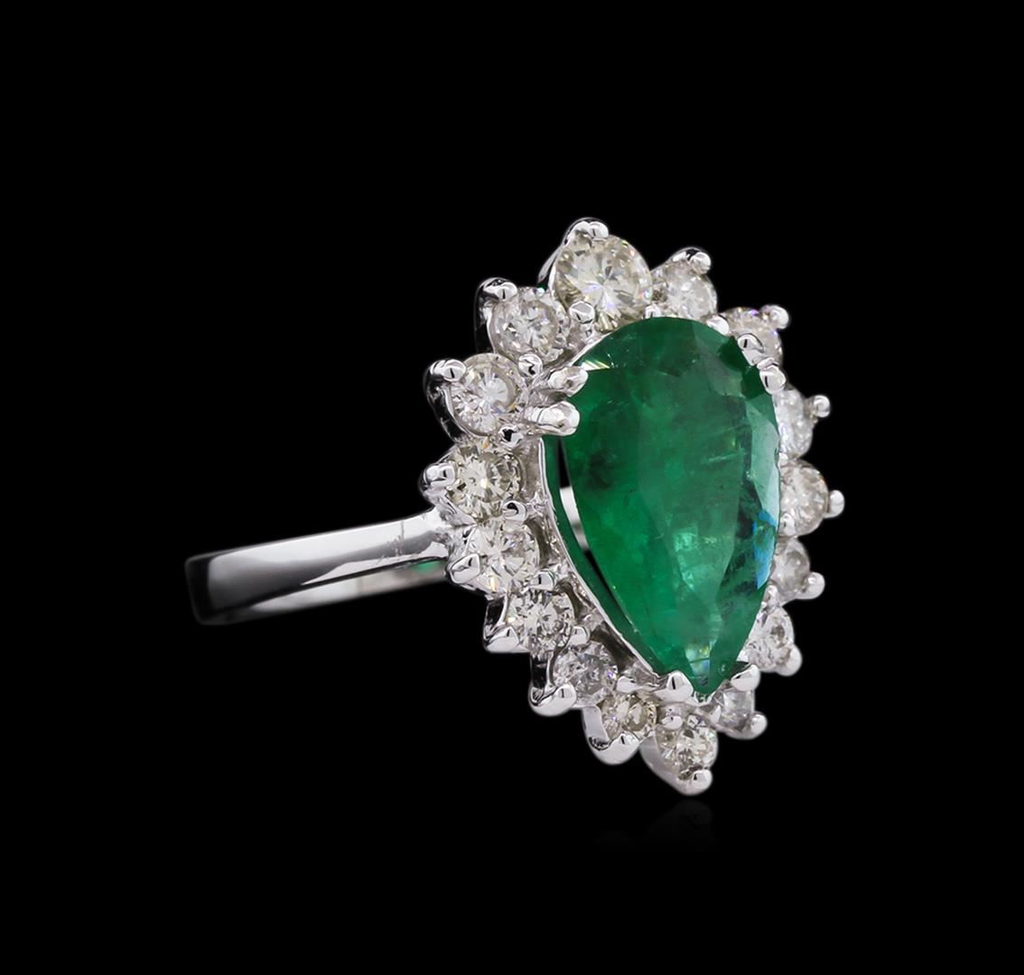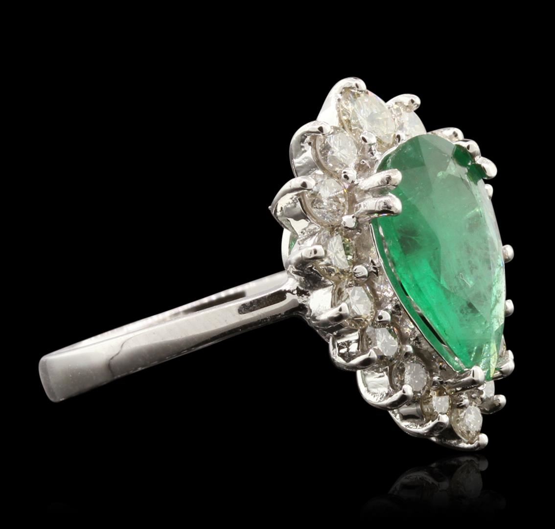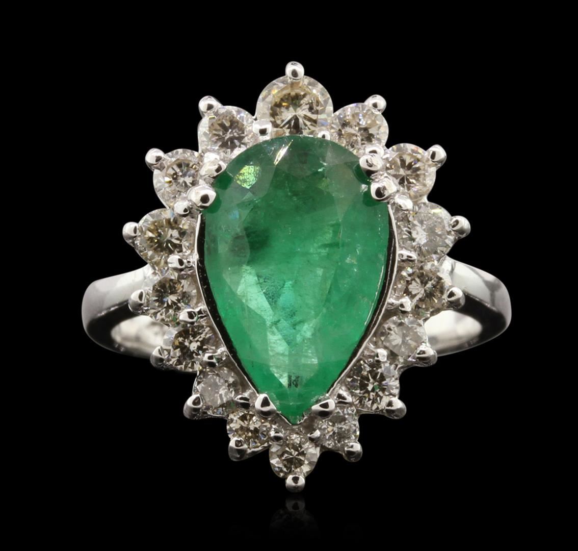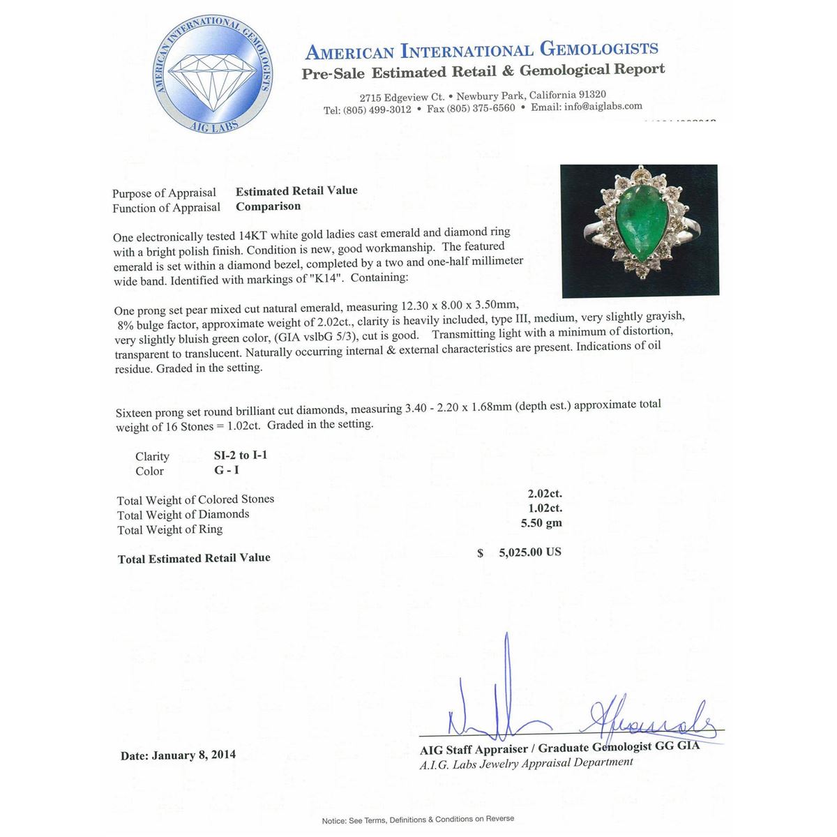 One electronically tested 14KT white gold ladies cast emerald and diamond ring with a bright polish finish. The featured emerald is set within a diamond bezel, completed by a two and one-half millimeter wide band. Identified with markings of "K14". Condition is new, good workmanship. Containing: One prong set pear mixed cut natural emerald, measuring 12.30 x 8.00 x 3.50mm, 8%. bulge factor, approximate weight of 2.02ct., clarity is heavily included, type III, medium, very slightly grayish, very slightly bluish green color, (GIA vslbG 5/3), cut is good. Transmitting light with a minimum of distortion, transparent to translucent. Naturally occurring internal & external characteristics are present. Indications of oil residue. Graded in the setting. Sixteen prong set round brilliant cut diamonds, measuring 3.40 - 2.20 x 1.68mm (depth est.) approximate. Total Weight of 16 Stones = 1.02ct. Graded in the setting. Clarity: SI-2 to I-1 . Color: G - I. Total Weight of Colored Stones 2.02ct. Total Weight of Diamonds 1.02ct. AIG Appraised at $5,025.00.