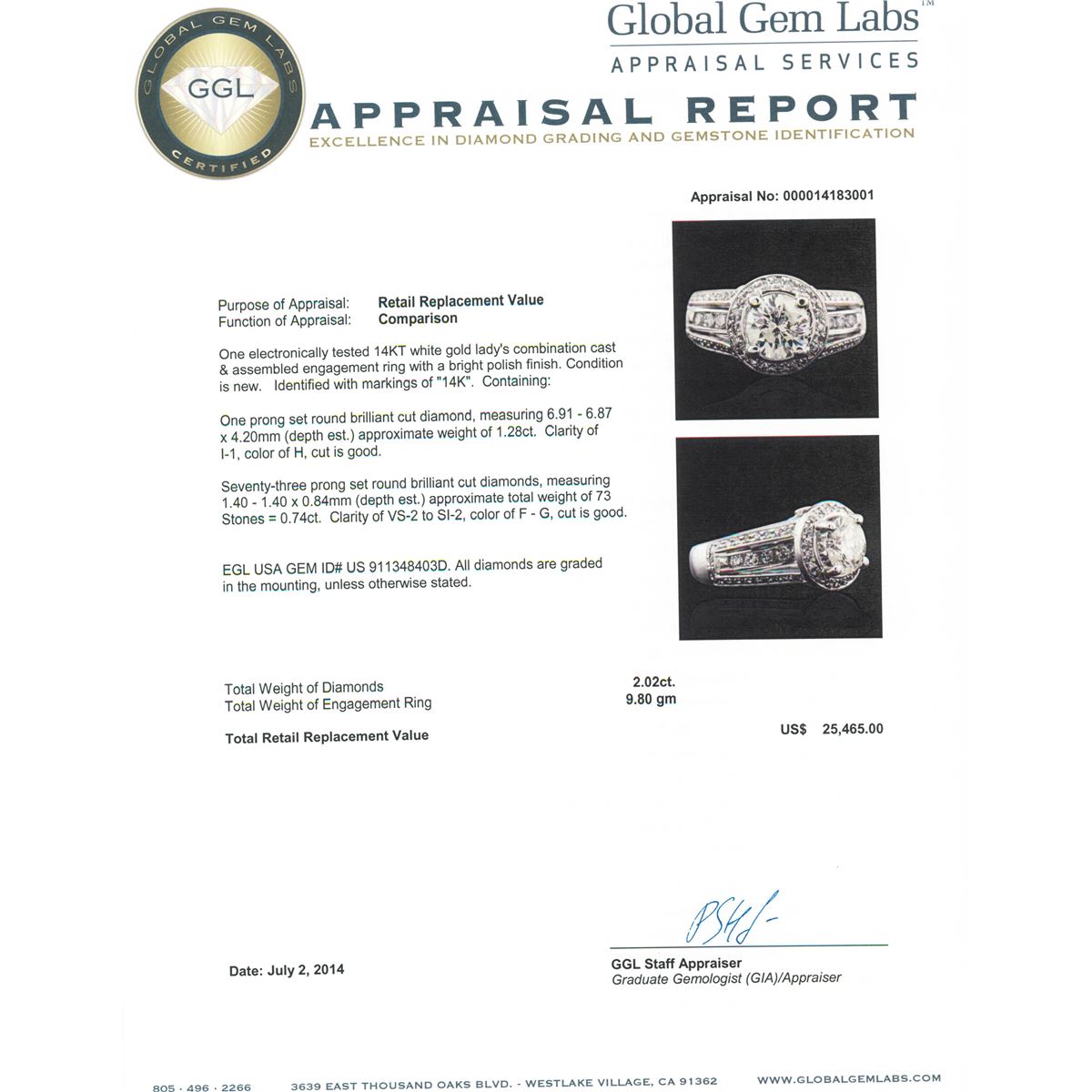 One electronically tested 14KT white gold Ladies combination cast & assembled engagement ring with a bright polish finish. Condition is new. Identified with markings of "14K". Containing: One prong set round brilliant cut diamond, measuring 6.91 - 6.87 x 4.20mm (depth est.) approximate weight of 1.28ct. Clarity: I-1. Color: H, Cut is Good. Seventy-Three prong set round brilliant cut diamonds, measuring 1.40 - 1.40 x 0.84mm (depth est.) approximate. Total Weight of 73 Stones = 0.74ct. Clarity: VS-2 to SI-2. Color: F - G, Cut is Good. EGL USA GEM ID# US 911348403D. All diamonds are graded in the mounting, unless otherwise stated. Total Weight of Diamonds 2.02ct. Total Weight of Engagement Ring 9.80 grams. GGL Appraised at $25,465.00.
