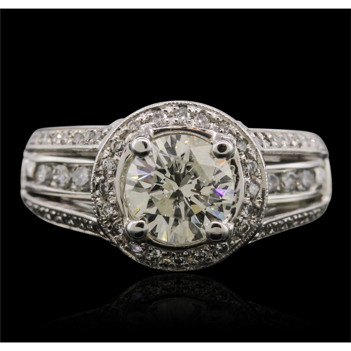 One electronically tested 14KT white gold Ladies combination cast & assembled engagement ring with a bright polish finish. Condition is new. Identified with markings of "14K". Containing: One prong set round brilliant cut diamond, measuring 6.91 - 6.87 x 4.20mm (depth est.) approximate weight of 1.28ct. Clarity: I-1. Color: H, Cut is Good. Seventy-Three prong set round brilliant cut diamonds, measuring 1.40 - 1.40 x 0.84mm (depth est.) approximate. Total Weight of 73 Stones = 0.74ct. Clarity: VS-2 to SI-2. Color: F - G, Cut is Good. EGL USA GEM ID# US 911348403D. All diamonds are graded in the mounting, unless otherwise stated. Total Weight of Diamonds 2.02ct. Total Weight of Engagement Ring 9.80 grams. GGL Appraised at $25,465.00.